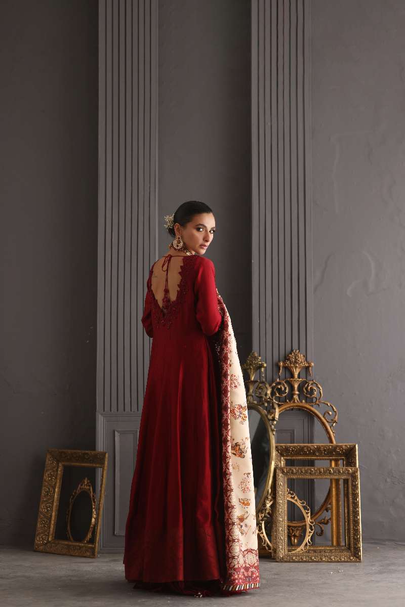 This ensemble evokes the spirit of royal opulence and storytelling, embodied through a deep red Anarkali and a Shikargah printed shawl.