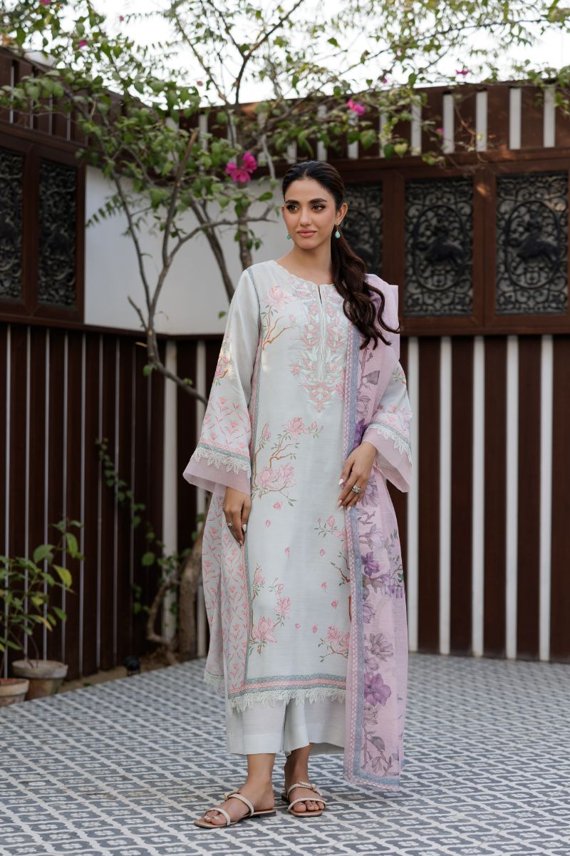 The print draws inspiration from china porcelain and ink painting. The delicate neck embroidery adds to the fragile essence of the entire piece. Printed bamber silk shirt (front back and sleeves) 3 Meters - Dyed bamber silk trousers 2.5 Meters - Printed cotton net dupatta 2.75 Meters - Embroidered neckline - Laces for shirt -