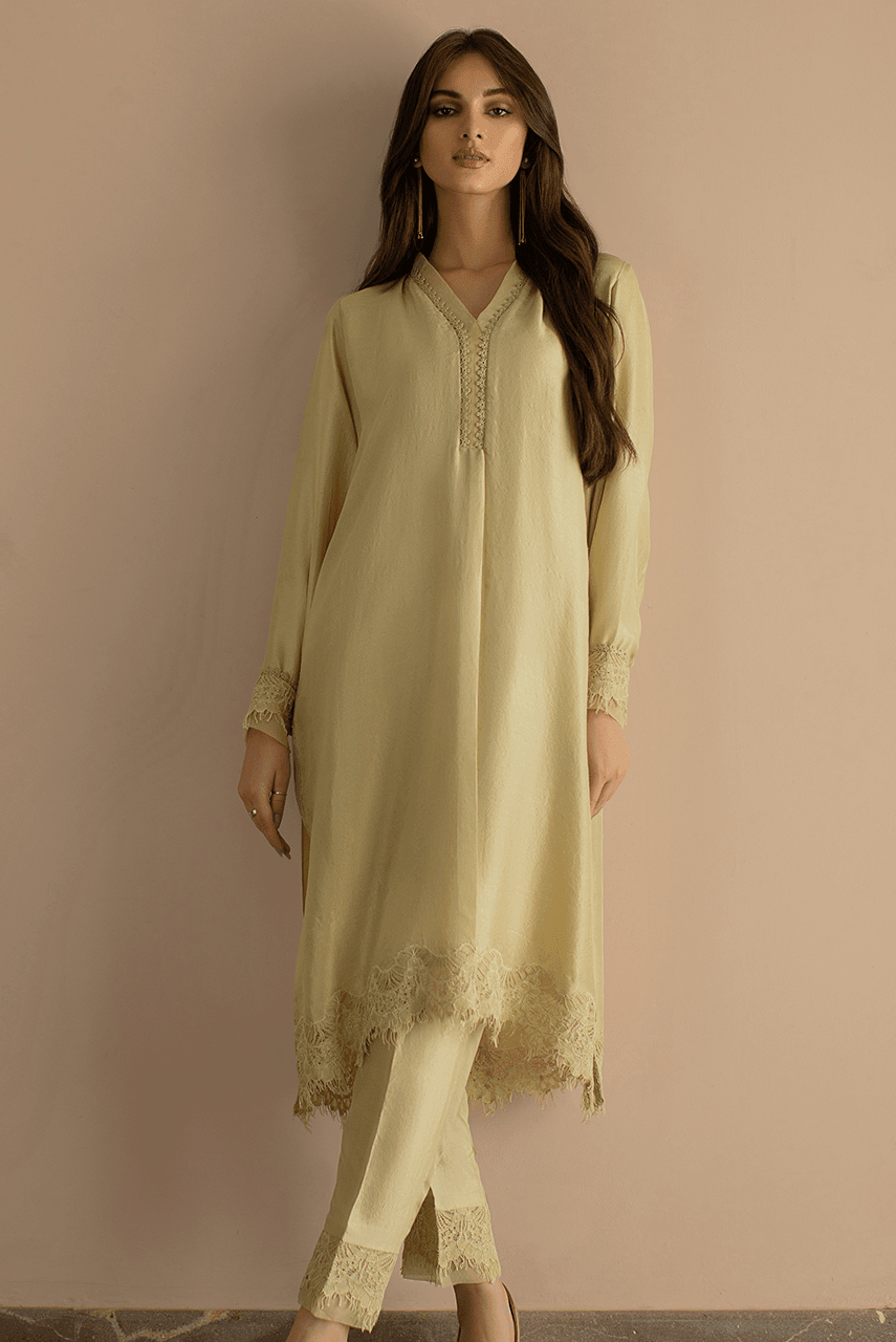 A pale olive green raw silk co-ord set finished with delicate Chantilly Lace and organza on the neckline, cuffs and pants.