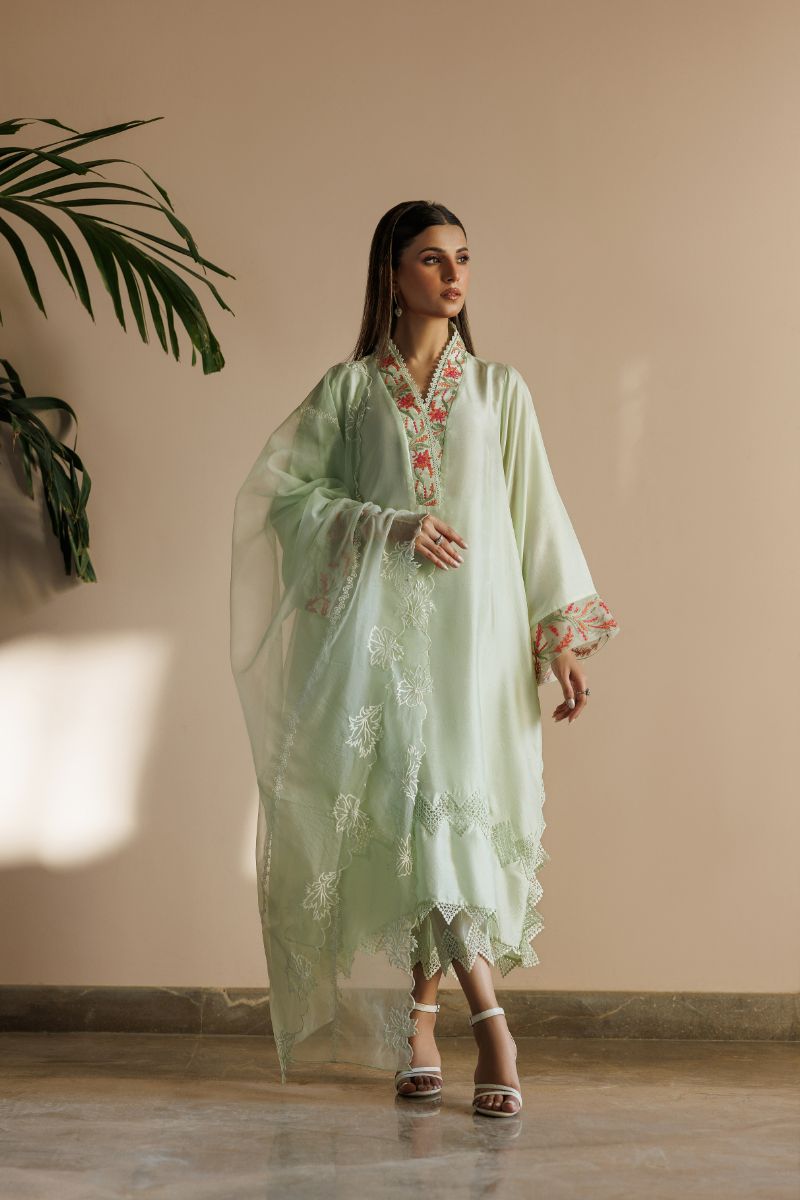 A raw silk tunic featuring aari embroidery on the neckline and sleeves finished with lace. It is paired with straight pants finished with organza and lace. The outfit is paired with an organza dupatta