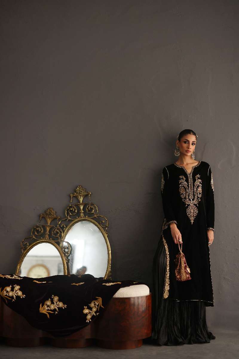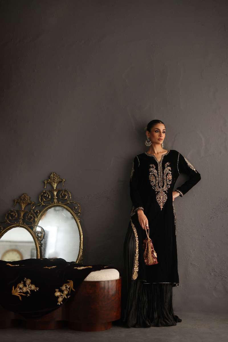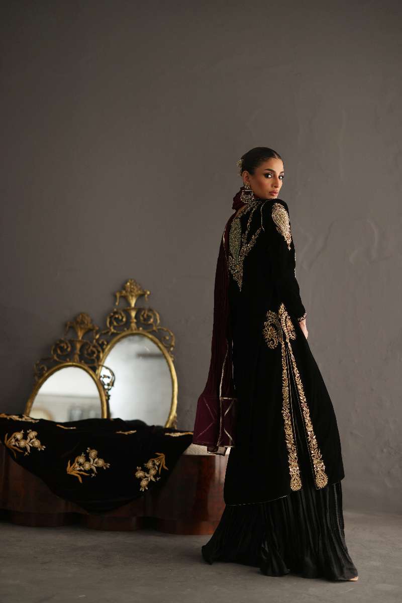 A statement black velvet long kurta adorned with intricate zardozi detailing on the back, neckline, and slits, highlighted with magenta and emerald accents. Paired with black crushed pants and a berry purple-toned crushed dupatta edged with a delicate gotta border for a regal finish.