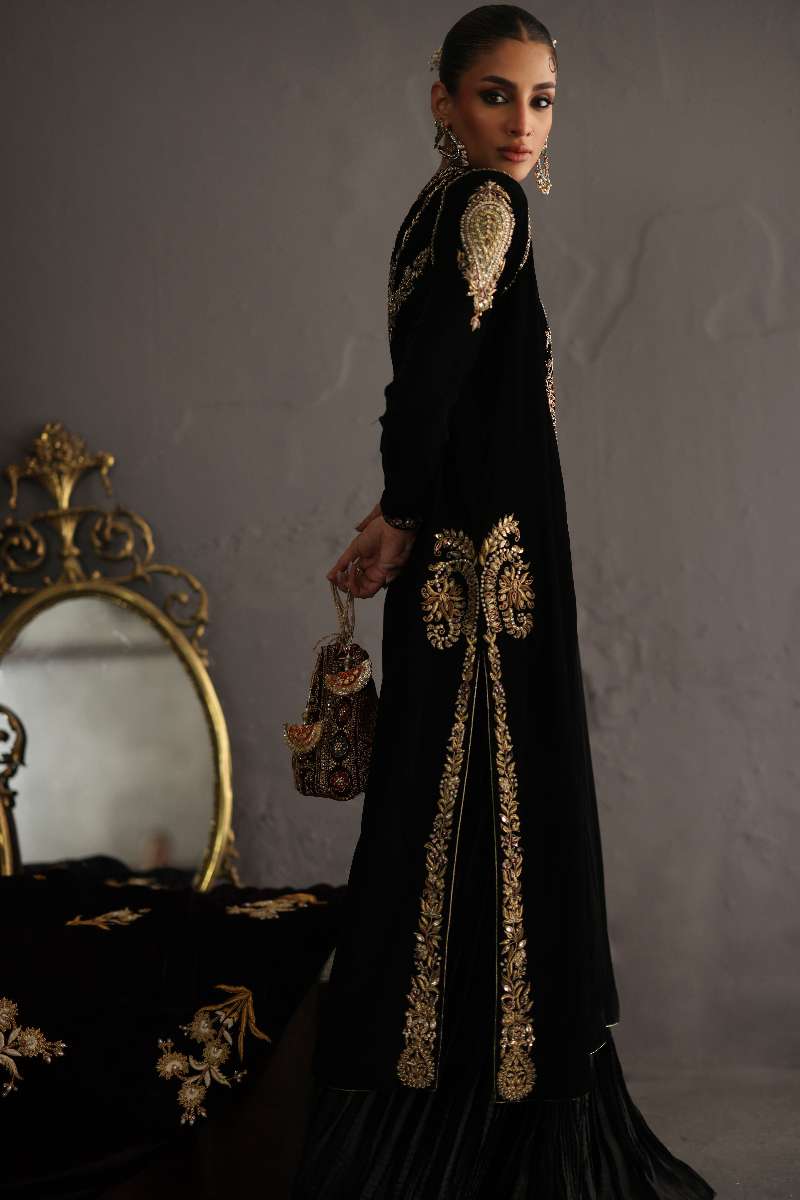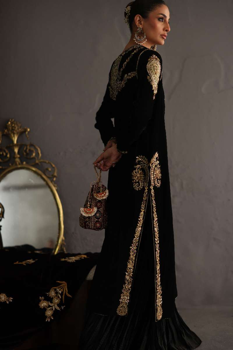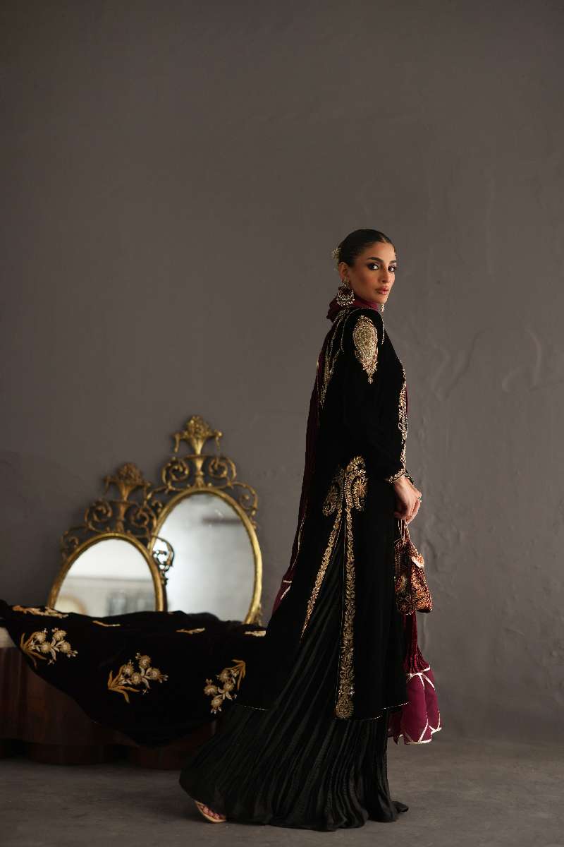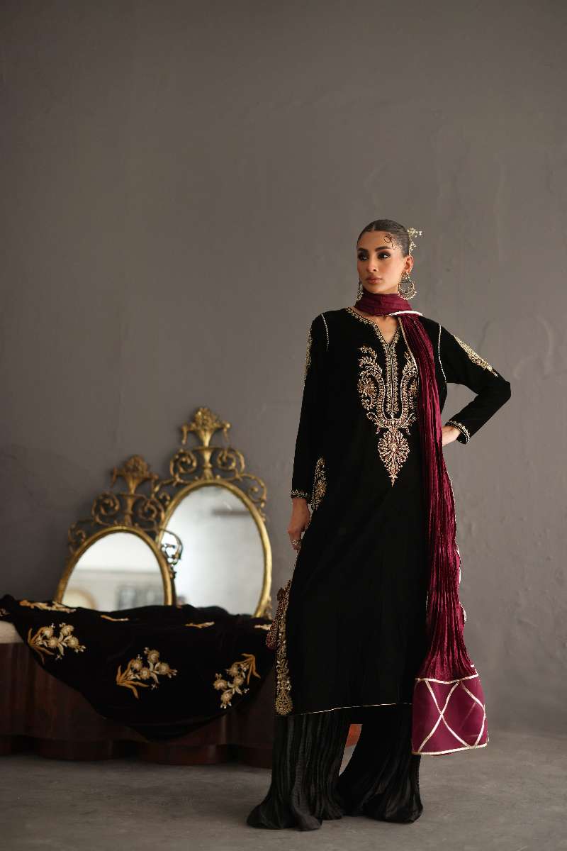 A statement black velvet long kurta adorned with intricate zardozi detailing on the back, neckline, and slits, highlighted with magenta and emerald accents. Paired with black crushed pants and a berry purple-toned crushed dupatta edged with a delicate gotta border for a regal finish.