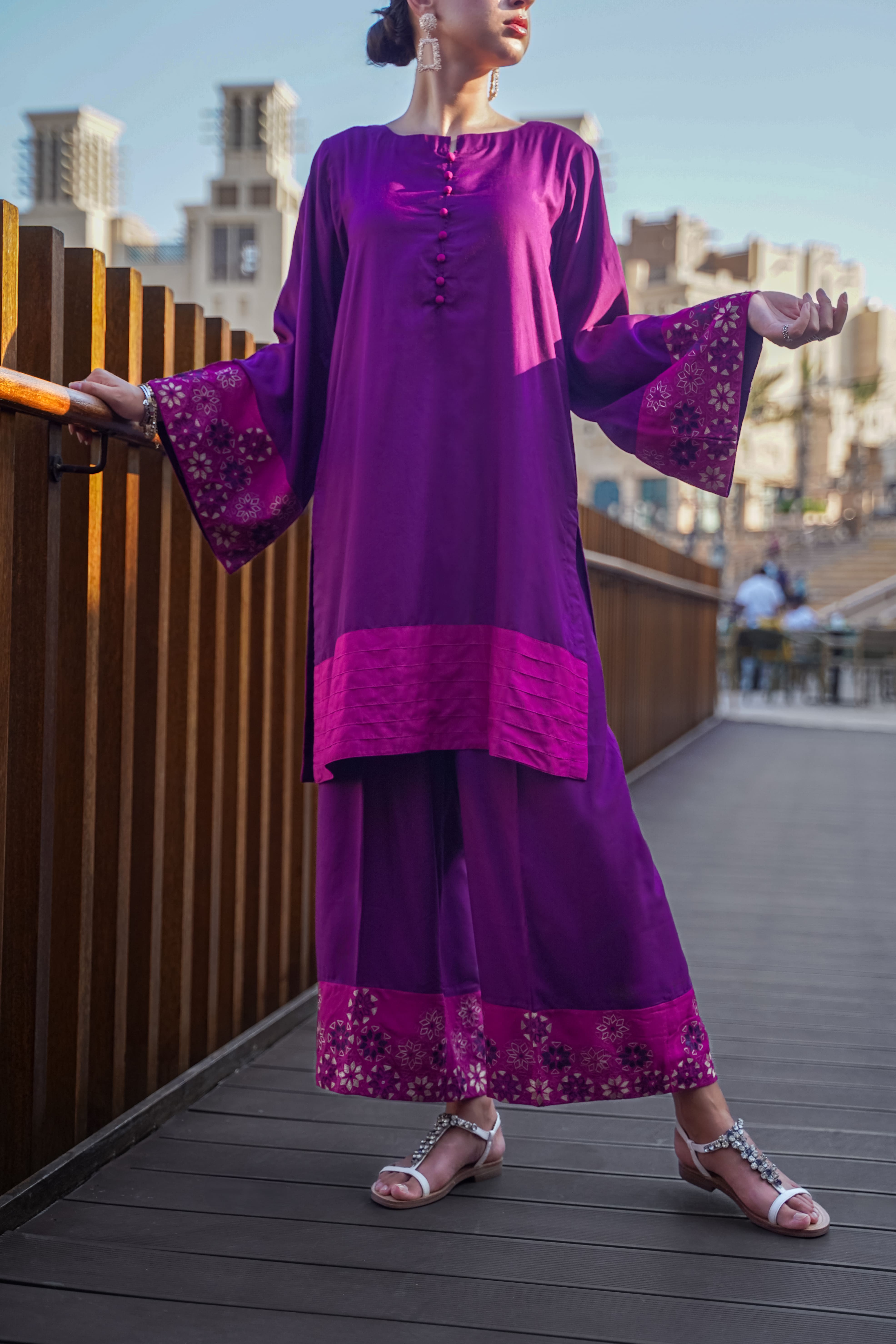 The dress showcases exquisite embroidery on the sleeves, featuring intricate motifs that add a touch of elegance. The trousers are adorned with complementary embroidery, enhancing the overall aesthetic with a cohesive design. Each detail is crafted with precision, blending tradition with contemporary style. The vibrant threads create a stunning visual impact, making the outfit perfect for special occasions. It's a two-piece set, perfect for any occasion.