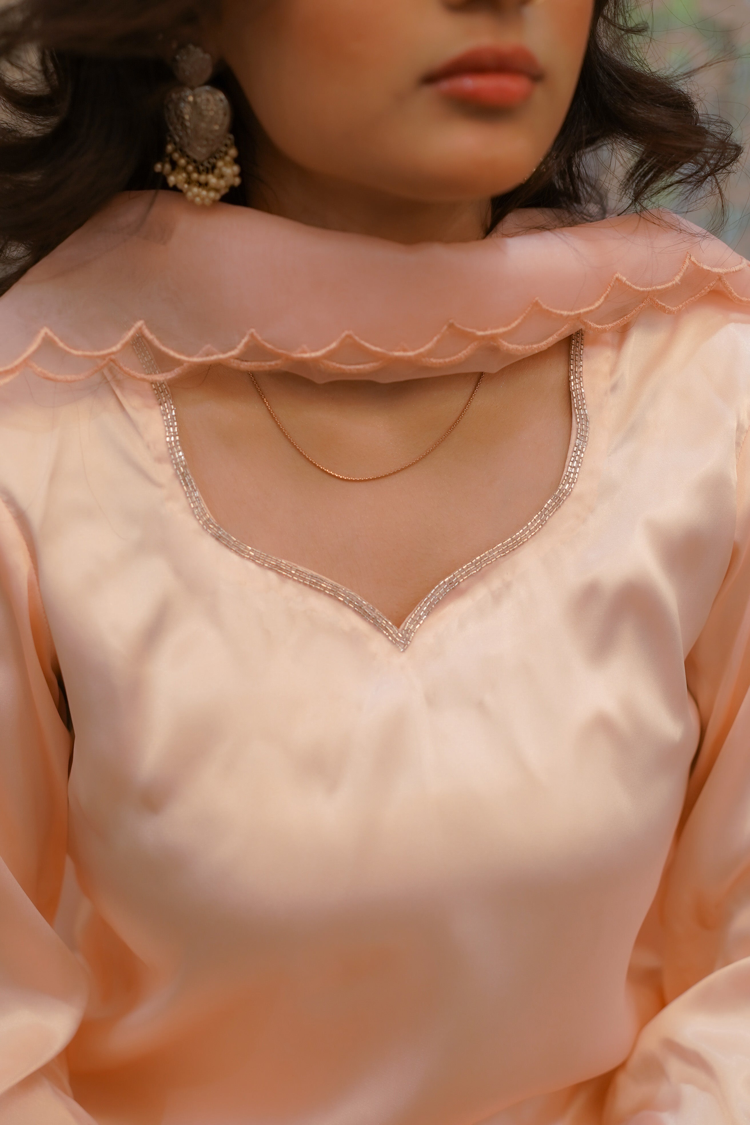 Introducing our exquisite Eastern ensemble in luxurious satin fabric. The broad sleeves are adorned with intricate lotus-shaped kut dana work, adding a touch of floral elegance and artisanal craftsmanship. Sleek kut dana border on the neckline. Paired with straight trousers and a lightweight organza dupatta perfect for festive celebrations, or any special event.