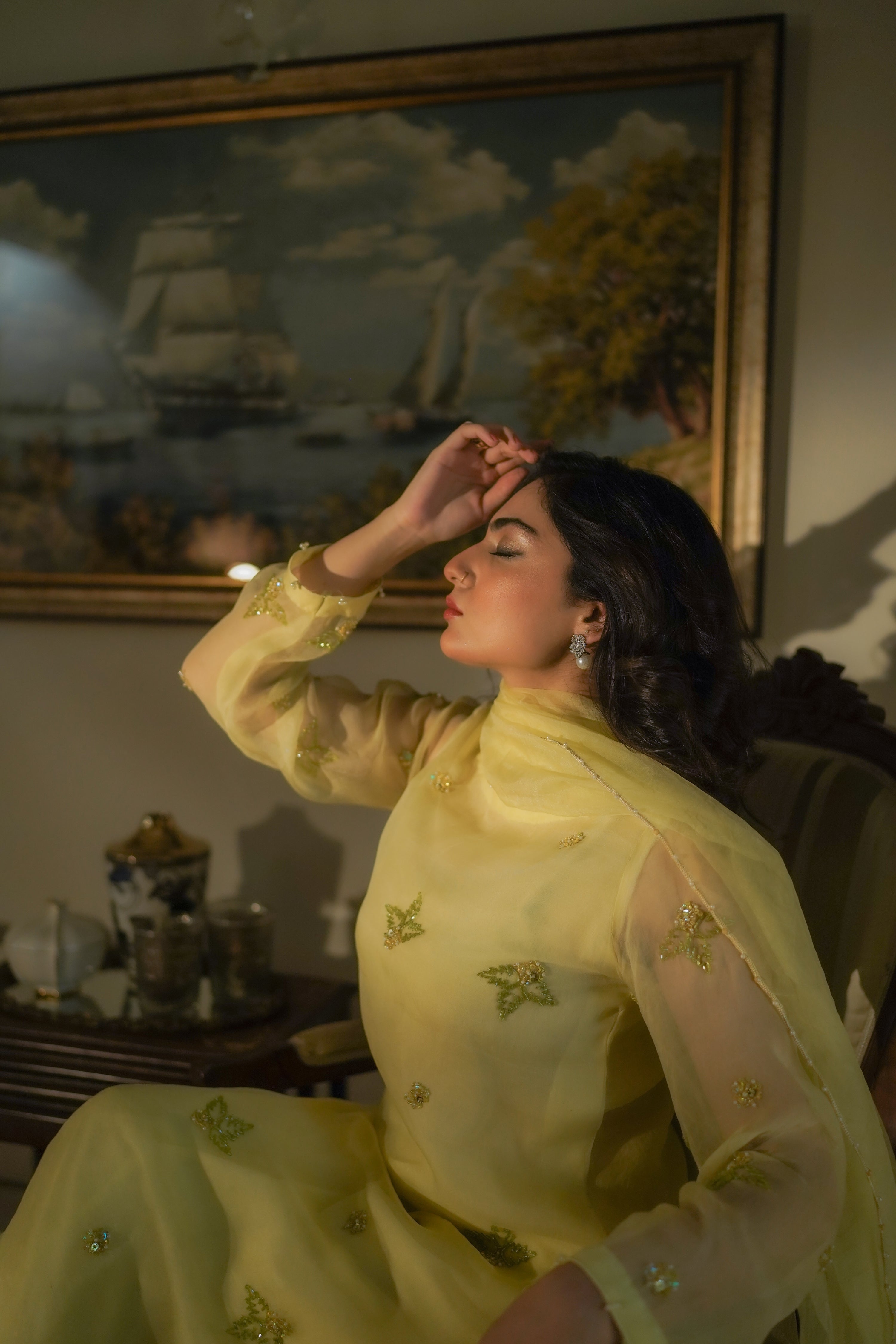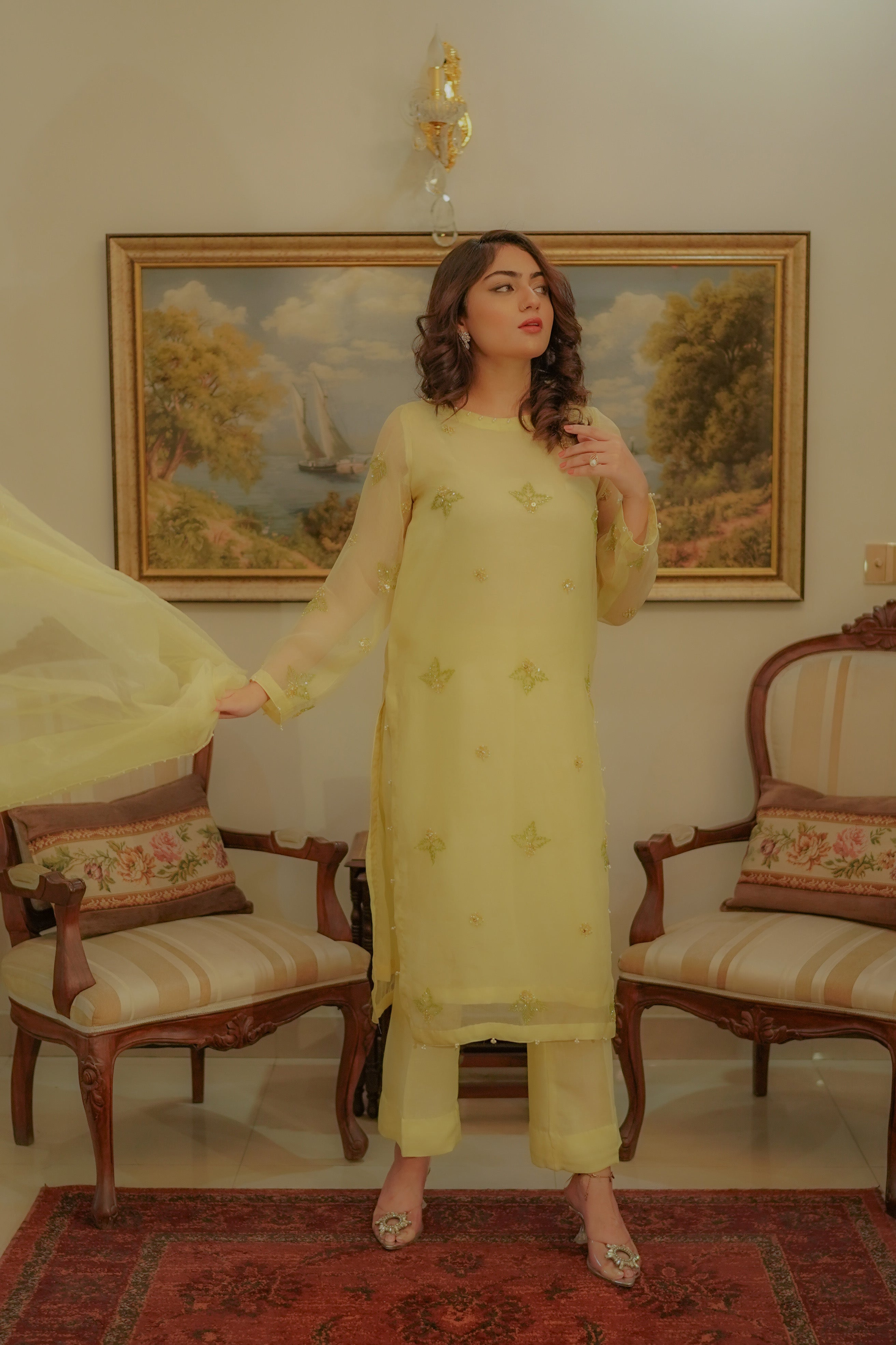 The outfit features a pastel yellow organza shirt, adorned with a stunning spray of crystals. The standout element is the green kut dana motifs, which provide a striking contrast and add a touch of traditional artistry. Edges of the shirt are intricately detailed with pearls. The outfit is completed with sleek straight pants and a matching organza dupatta, creating a harmonious and graceful look. Ideal for festive gatherings, or special events.