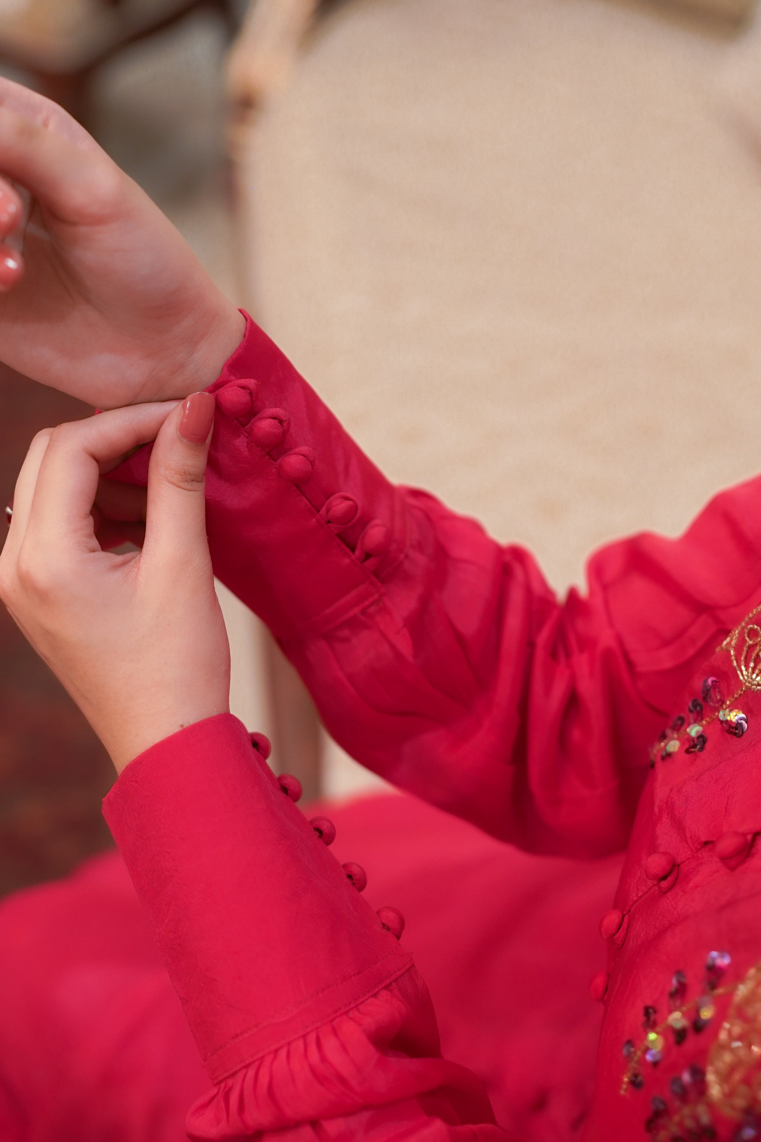 Elevate your wardrobe with our stunning dress, a masterpiece that combines vibrant hues with exquisite detailing. The fuchsia pink grip shirt is the focal point, adorned with champagne-colored kut dana and multi-shaded sitara motives that add a mesmerizing sparkle. The shirt features a chic button-down design with a centre cut, blending modern style with traditional elements seamlessly. Complementing the shirt are straight pants with champagne crystal detailing on the side. Perfect for festive celebrations, or any special occasion, this dress is designed to make a bold and beautiful statement.