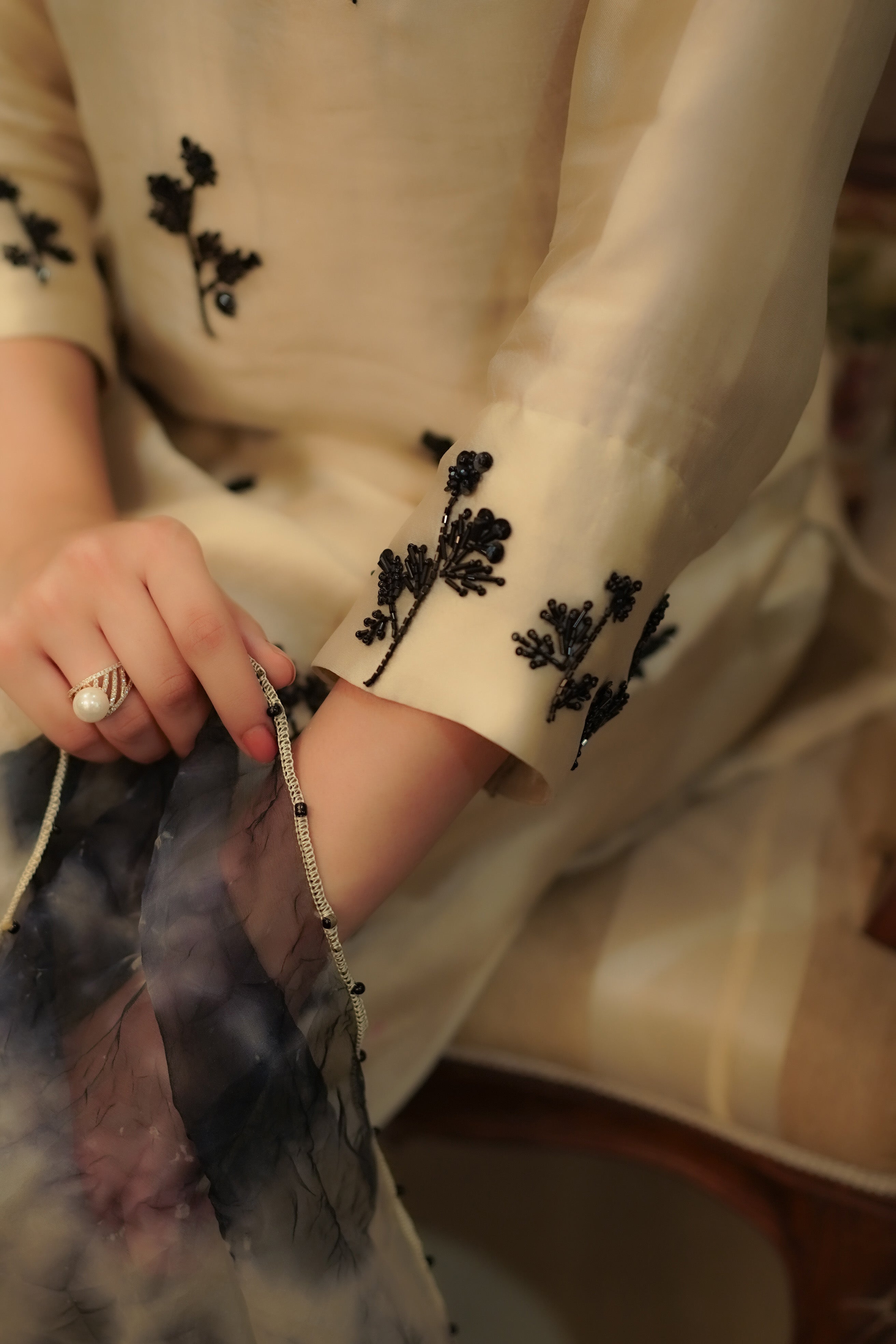 Champagne-colored tissue silk shirt featuring intricate black kut dana motifs that create a striking and timeless contrast. This exquisite shirt is paired with chic wide-leg pants, offering a contemporary silhouette that ensures comfort and style. The outfit is elevated by an electric tie-dye organza dupatta, adding a vibrant and artistic touch that sets this ensemble apart. Perfect for festive occasions, or any special event.
