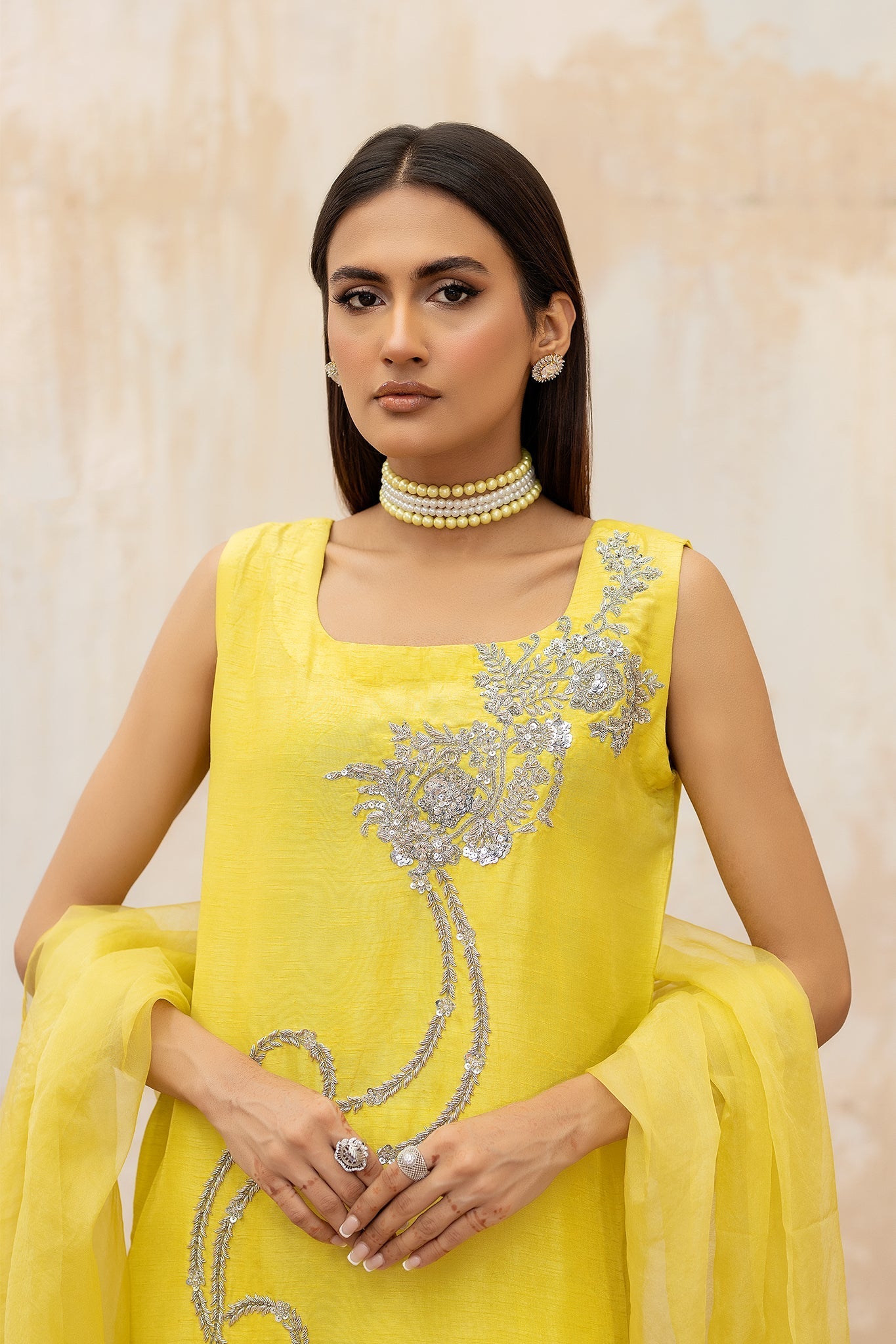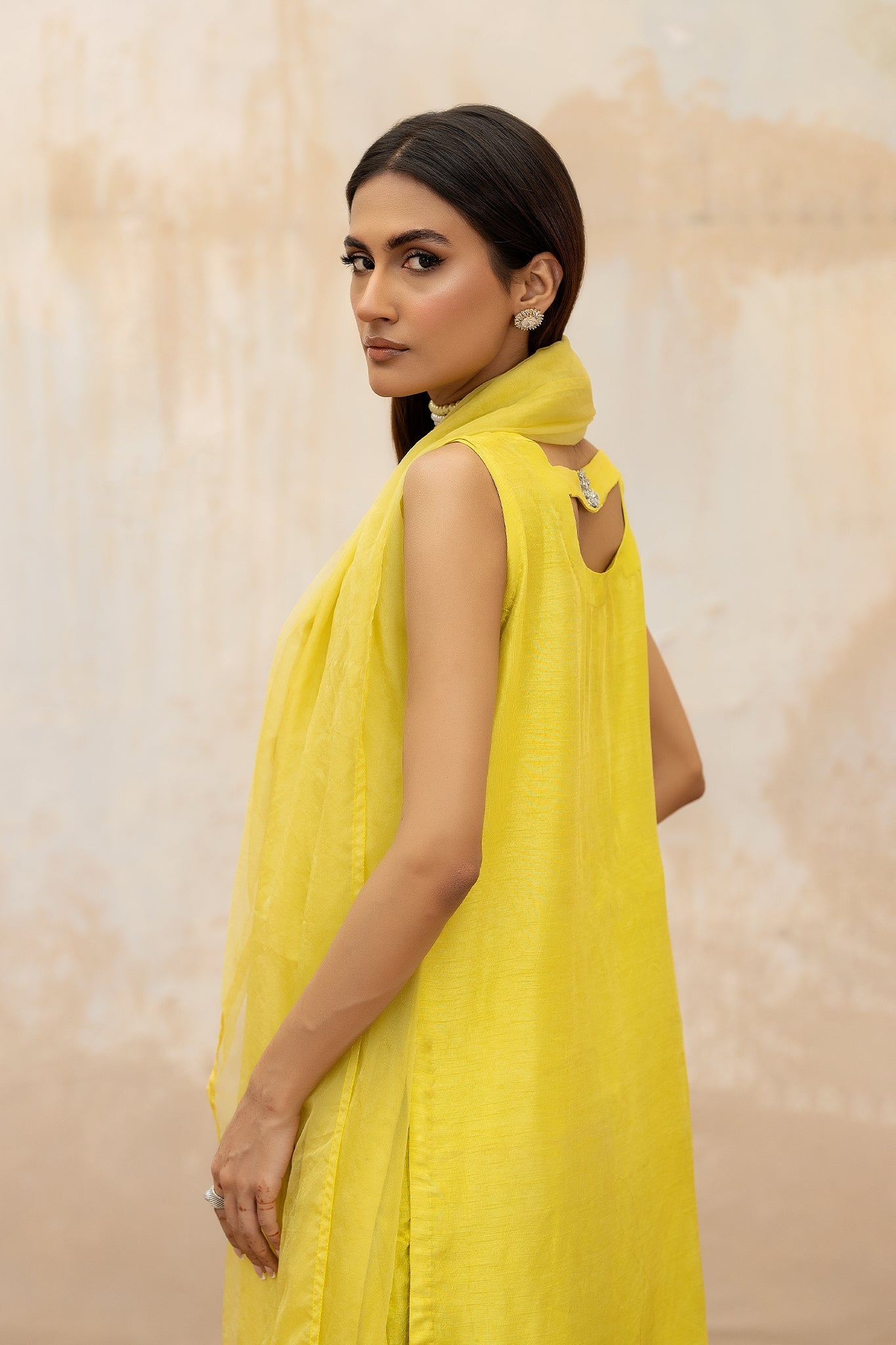 This vibrant lime-yellow outfit features delicate silver embellishments across the shirt, adding a touch of elegance to the simple silhouette, paired with Dhaka shalwar and a matching dupatta making it a stylish choice for festivities.