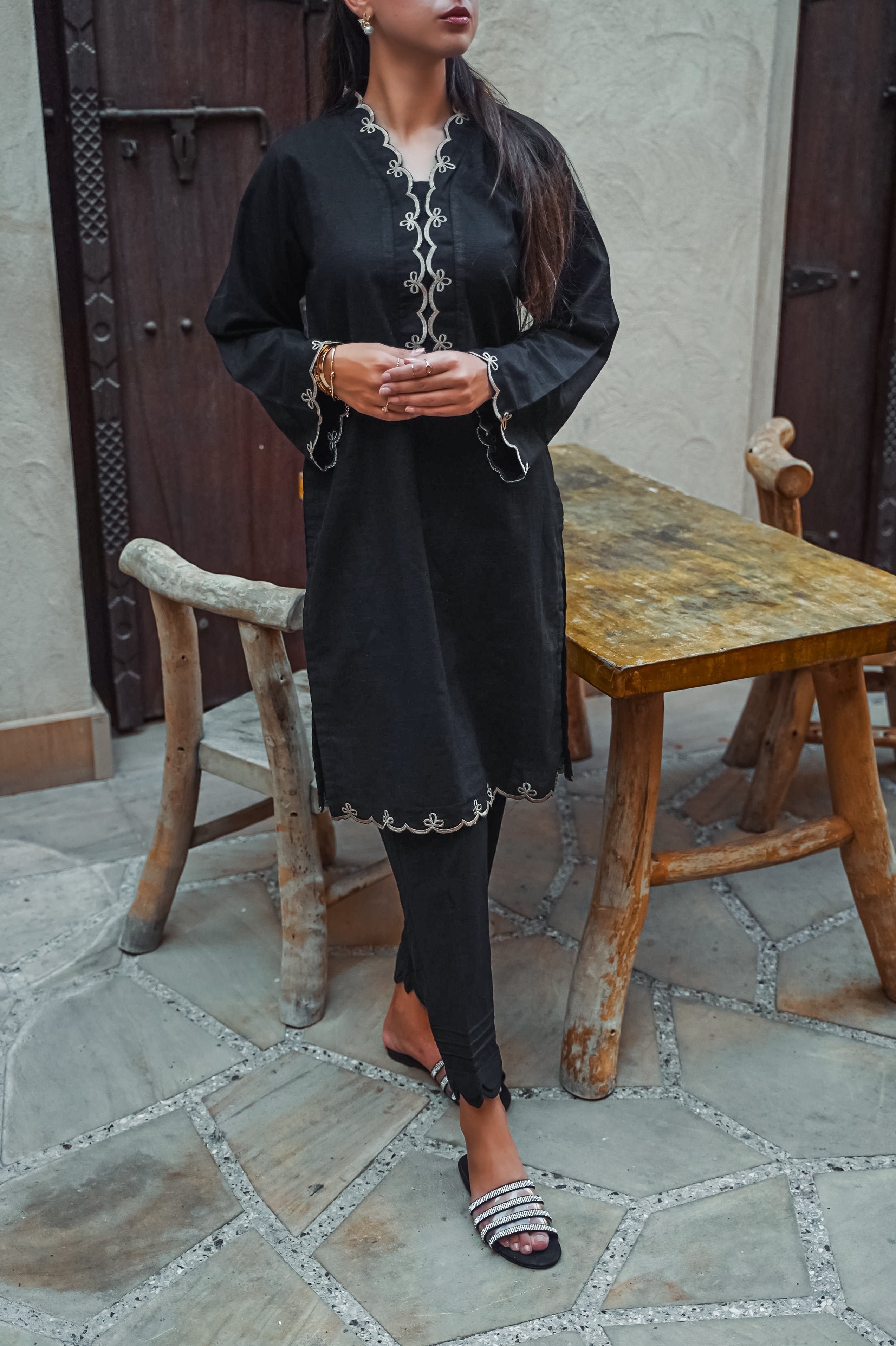 Another color for this tunic dress features intricate beige embroidery that blooms across the neckline and sleeves, showcasing delicate floral motifs with exquisite detailing. The elegant patterns flow gracefully, adding a touch of sophistication and artistry to the design. Scalloped edges on the matching maroon pants complement the tunic, enhancing the overall aesthetic. Perfect for special occasions, this dress effortlessly combines comfort and style with its timeless elegance.