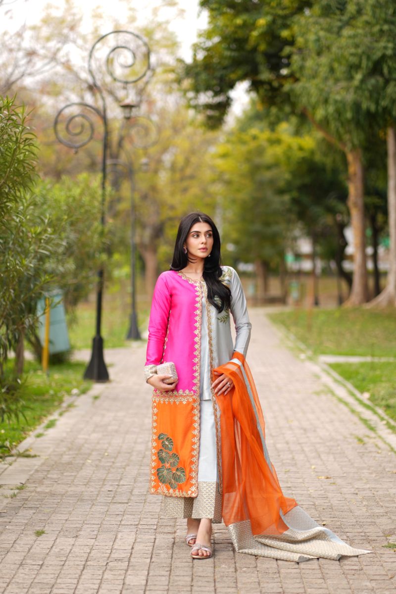 Drape yourself in effortless elegance with this luxurious 4-piece ensemble, crafted from premium Sheesha Silk. This stunning outfit features a harmonious blend of vibrant orange, soft grey, and delicate pink, creating a mesmerizing colour story that’s perfect for festive occasions. The inner shirt offers a sleek, graceful base, while the embellished upper shirt adds opulent detailing, bringing in intricate handwork and shimmering accents that catch the light beautifully. Complete with matching trousers and a flowy dupatta, this ensemble is a true statement of refined glamour and timeless style.