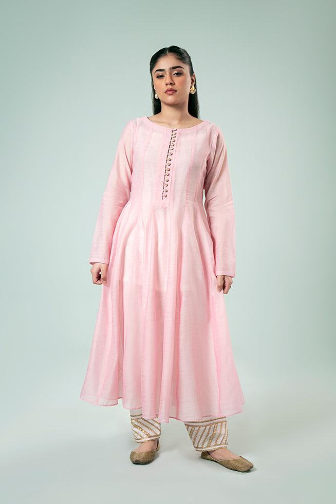 A timeless classic in paper silk, featuring a kali daar design with a beautifully adorned neckline finished with tilla work buttons.