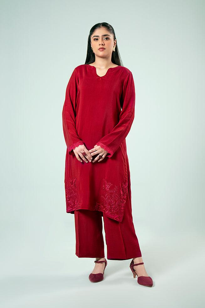 Make a statement with this eye-catching co-ord set crafted from luxurious PK silk. The kurta features embroidered daman patches and sleeves borders, paired elegantly with straight trousers.