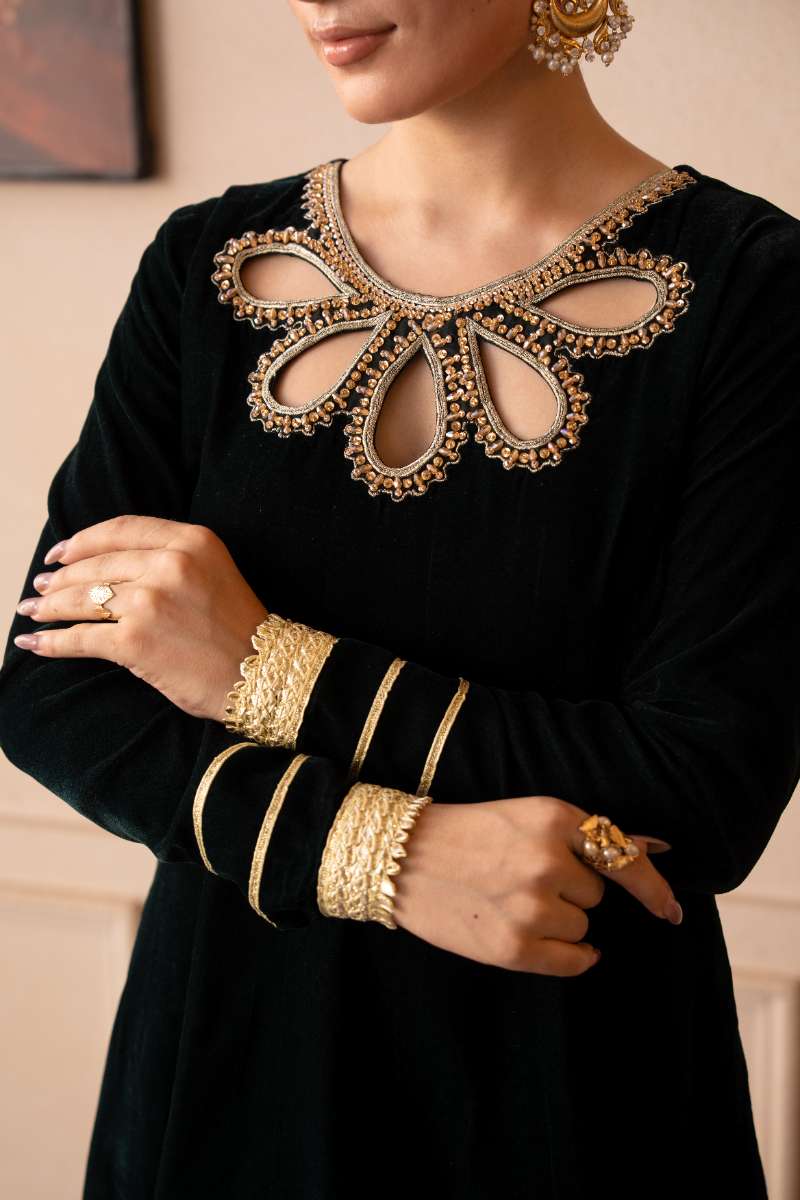 A timeless classic reimagined with modern finesse, this emerald green velvet Pishwas is the perfect blend of regal charm and delicate embellishment. Crafted in luxurious velvet, the piece features fine details that elevate its graceful silhouette, making it ideal for festive and formal occasions.