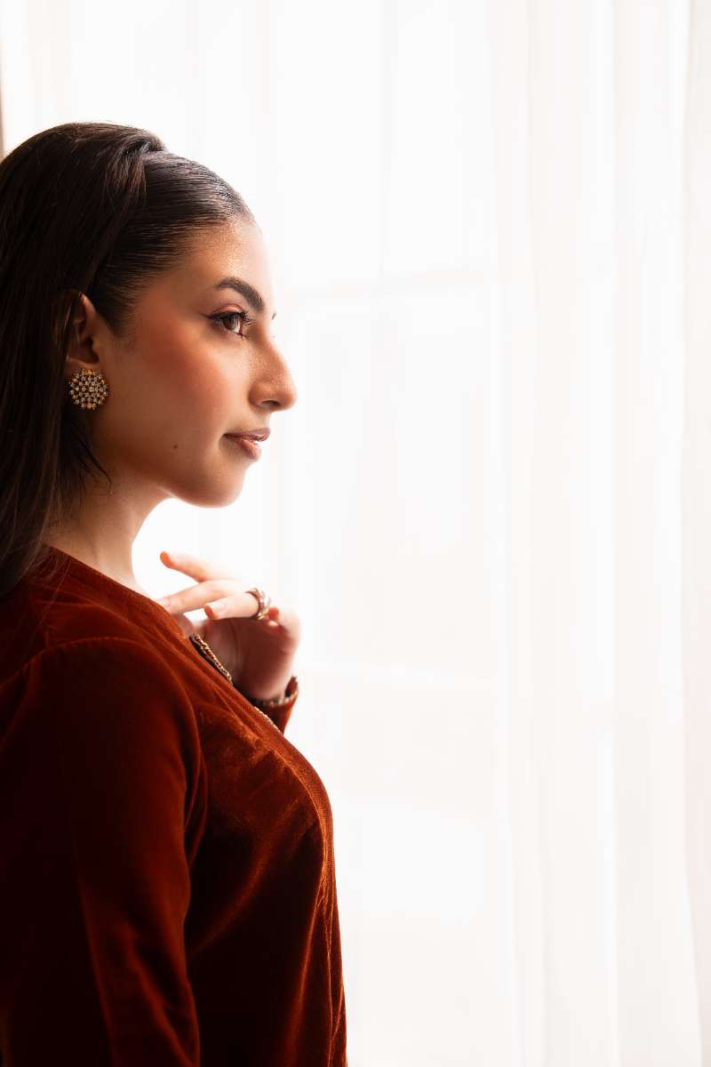 Effortlessly sleek and understated, this front-open kaftan in rich brown velvet brings a modern edge to classic winter wear. Designed with clean lines and thoughtful detailing, it’s perfect for curated festive looks or formal evenings. Details: • Style: Front-open kaftan silhouette with a relaxed yet refined fit • Fabric: Deep brown premium velvet • Embroidery: Subtle adda work on the pocket and buttons, finished with copper-toned embroidery for a touch of contrast • Pants: Paired with straight-cut silk trousers for a polished finish