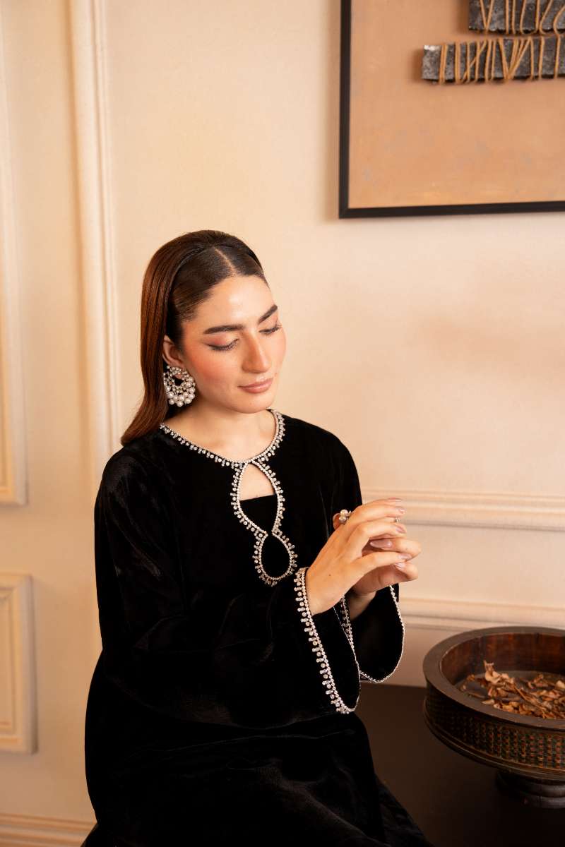 Elevate your evening look with this luxurious 2-piece black velvet outfit, a timeless blend of elegance and craftsmanship. Designed for the modern woman who appreciates tradition with a touch of glamour, this ensemble is perfect for festive gatherings, weddings, or formal occasions.