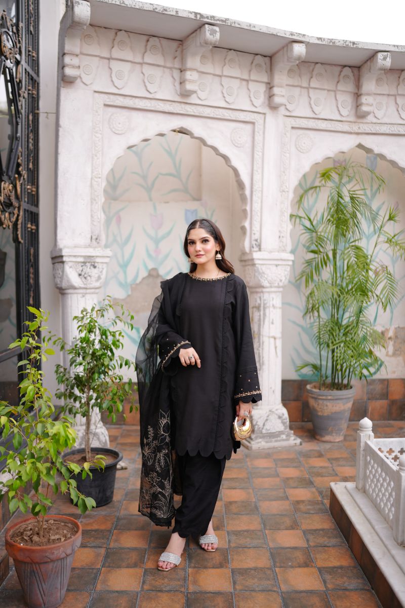 This black 3-piece embroidered silk dress with an organza dupatta is the perfect fusion of classic sophistication and graceful detailing. Crafted from luxurious silk, the shirt features elegant embroidery that adds richness and texture to its timeless black base. Paired with sleek matching trousers, the ensemble creates a refined silhouette ideal for formal or festive occasions. The look is beautifully completed with a sheer embroidered organza dupatta, adding a touch of delicacy and elegance. Whether for a special evening event or a traditional celebration, this outfit offers a poised and polished statement.