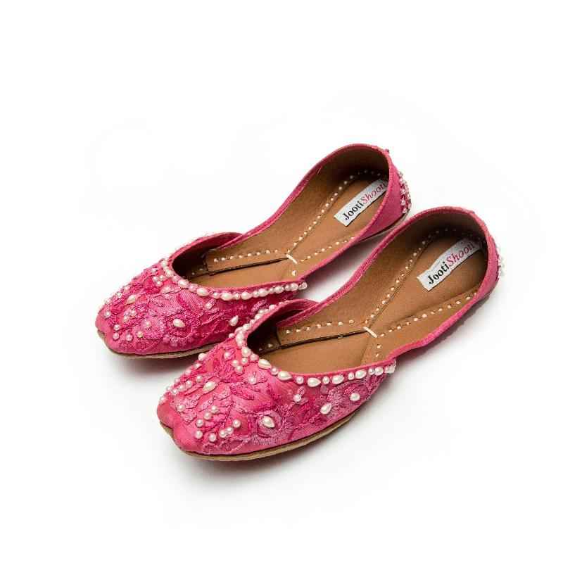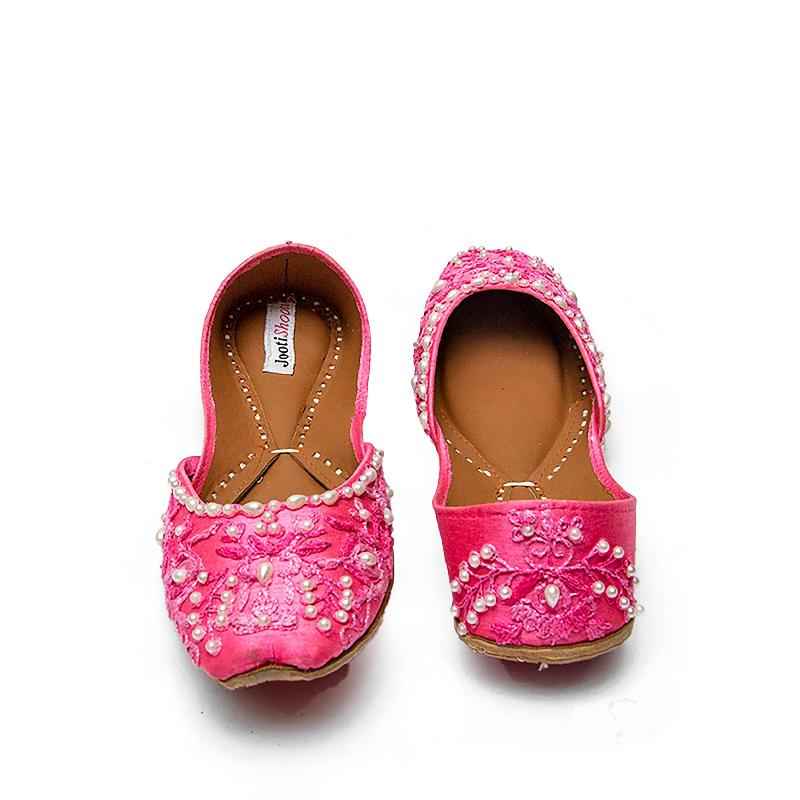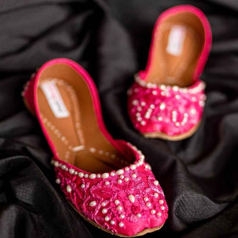 Beautiful candy pink khussa with intricate shadow thread embroidery of similar hues, finished with half cut pearls. This pair is a perfect complement to your favorite plain or print-forward attire.