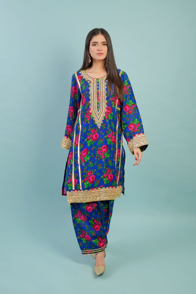 This exquisite Festive/Party Wear Kurta Set from Gulenoor is a fashion masterpiece. Made from luxurious acrylic fabrics, the straight blue kurta features stunning Gota work detailing, giving it a festive allure. Complete with a shalwar bottom, this two-piece set is perfect for all seasons. Elevate your style with this outstanding outfit and enjoy its comfort and look.