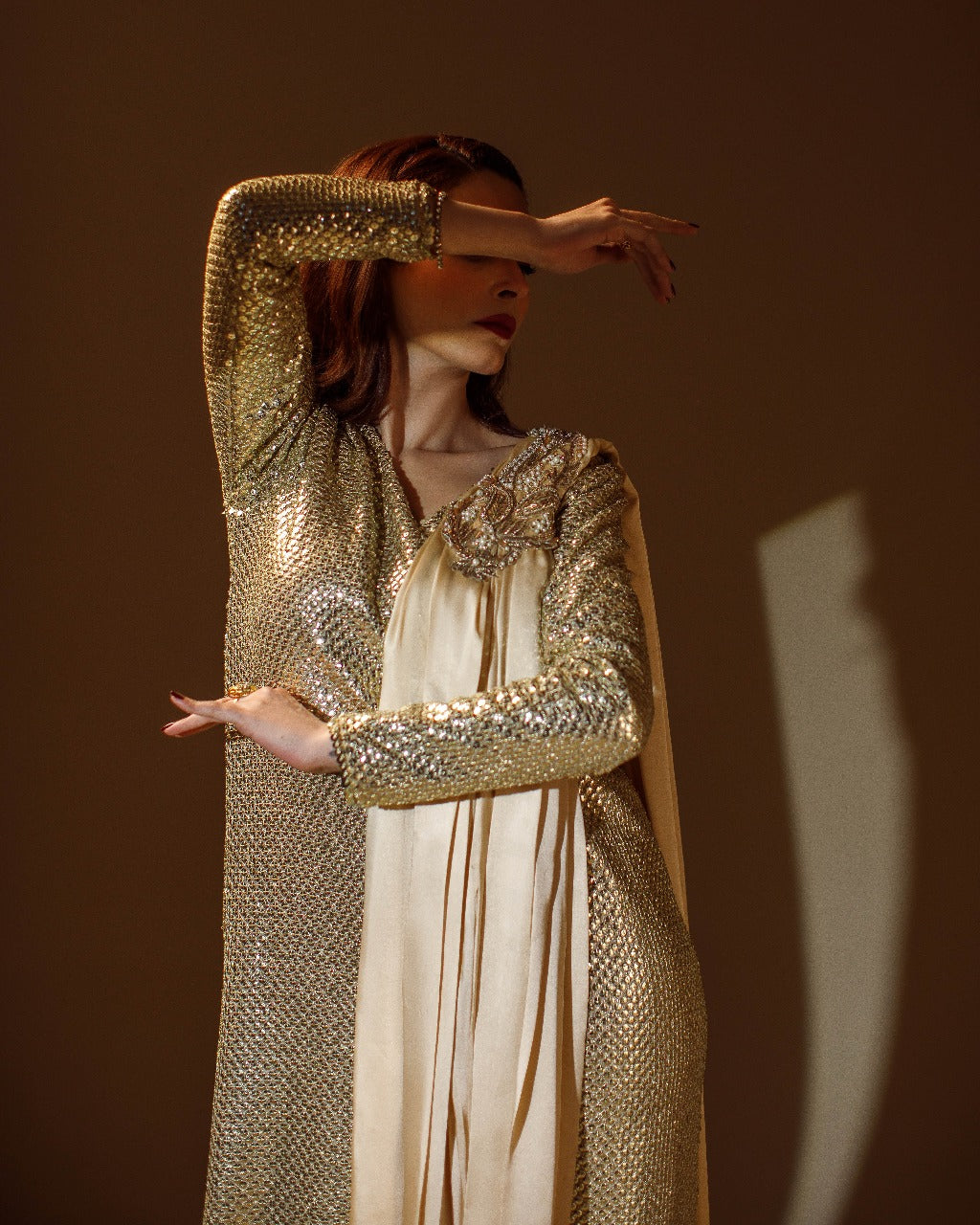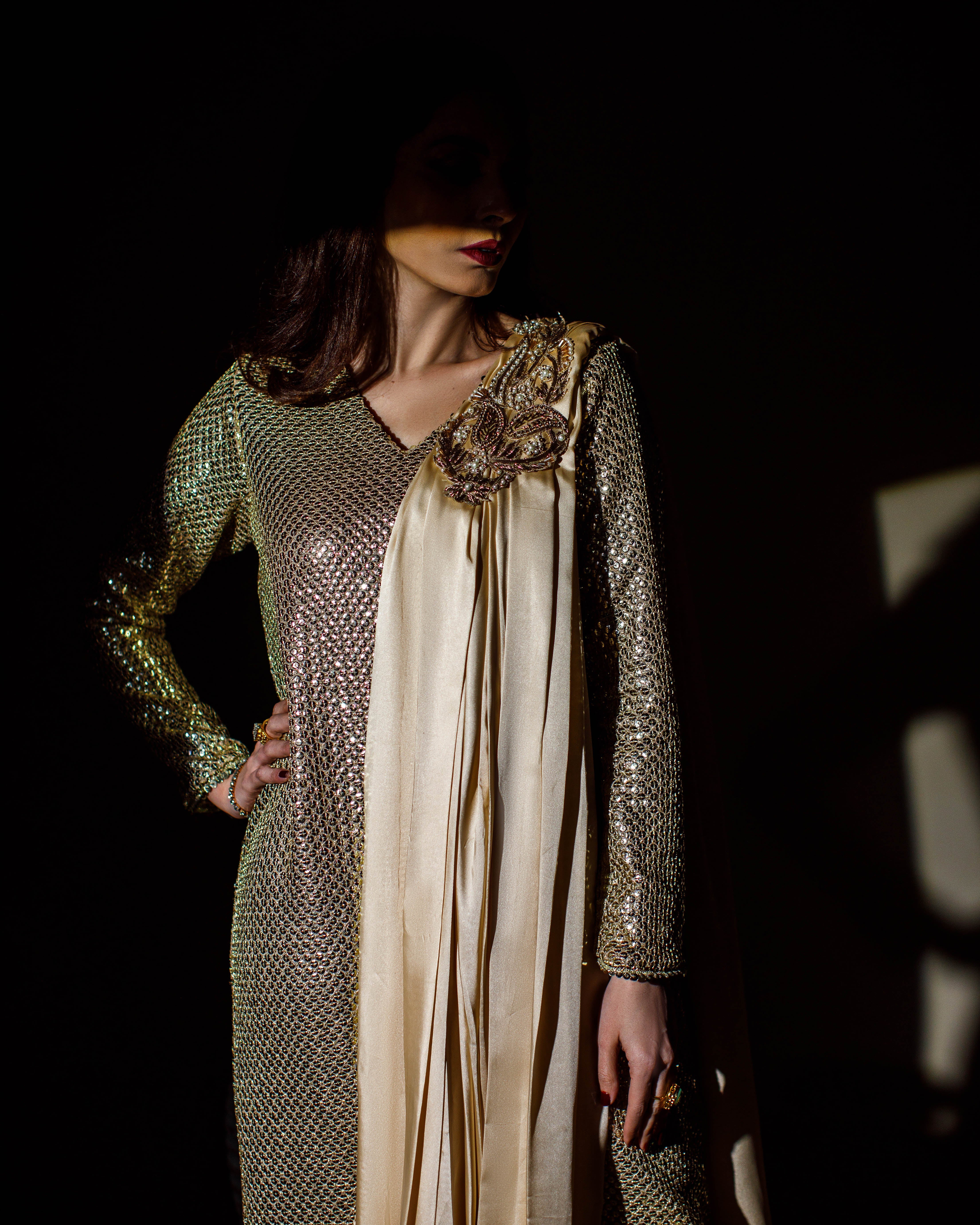 The Golden Mirage Georgette Shirt features shimmering sequins and a handmade shoulder motif, paired with an attached dupatta for an elegant, sophisticated look