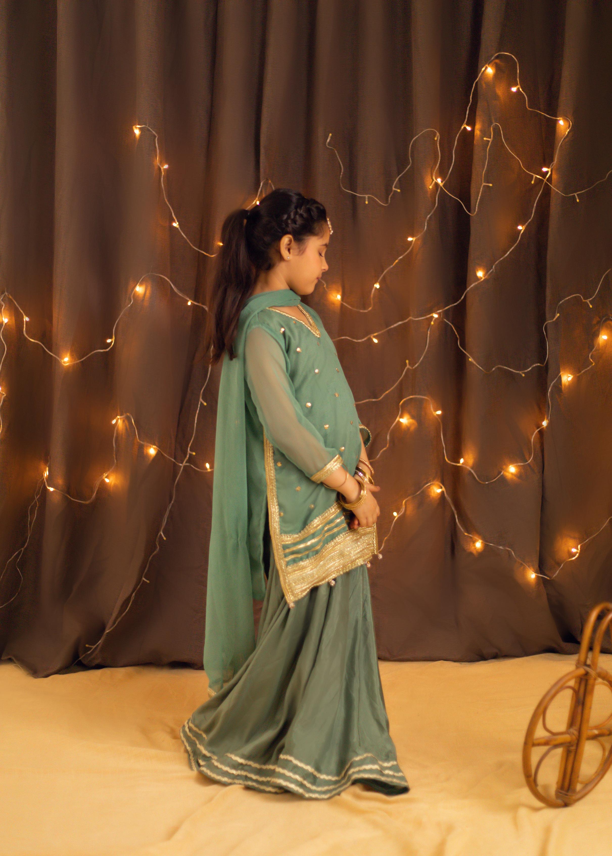 Our little fashionistas are ready to shine in this the perfect pastel green palazzo set, breaking away from the usual contemporary looks. The intricate embroidery, lace detailing, and subtle gold touches strike a balance between trendy and elegant