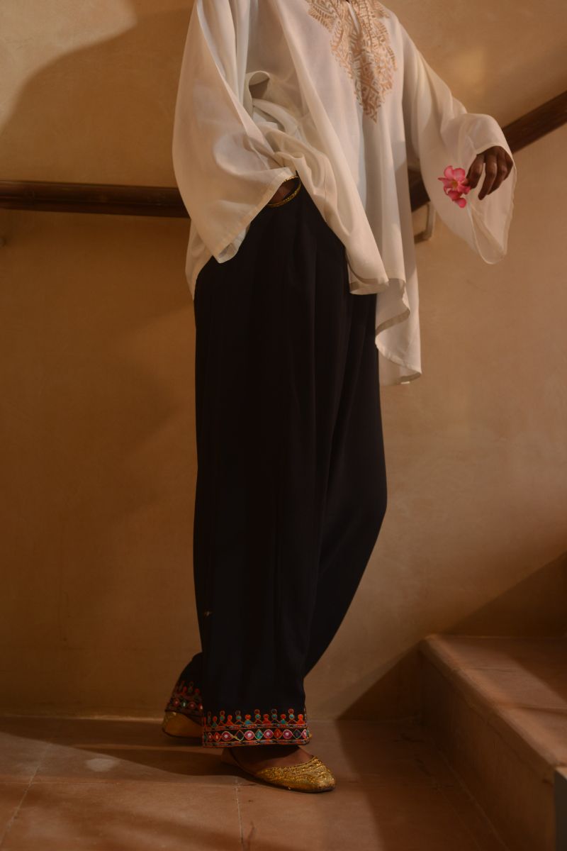 Introducing Jugnu, the Gulabo Shant trouser shalwar with a wide hem embroidered in a traditional border. The perfect blend of shalwar and trouser, it is the perfect addition to your wardrobe & it has pockets! Ever so versatile, pair it our Seher kurta or any other of your choice for an effortlessly chic look!