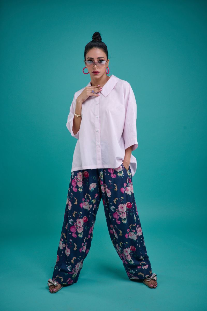 Comfortable & Chic! A fun pinstripe top in pink with an easy button-down design, paired with our Gulabo Shant. The perfect blend of shalwar and trouser, this is a perfect addition to your wardrobe & it has pockets! The wide hem stitch detailing elevates the trousers' look.