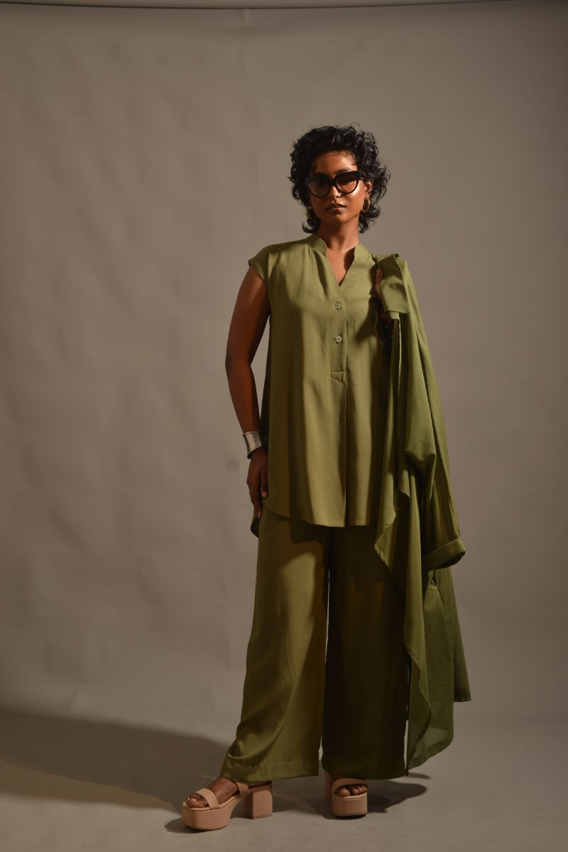 Cap sleeve top with a high band collar and classic V neck with front buttons. The front pleat makes a statement. The top is finished with a rounded hem with longer hem at back. Paired with loose-cut pants with pockets for the ultimate summer look.