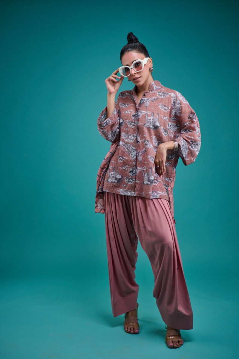 Wear your Heart in our all new Toile de Pakistan Collection! Our Toile de Pakistan Print are an ode toile heritage buildings in the landscape of the country. This co-ord set features a loose fit top with front buttons and a band collar, paired with our newest shalwar, perfectly pleated with a wide hem for an edgy look.