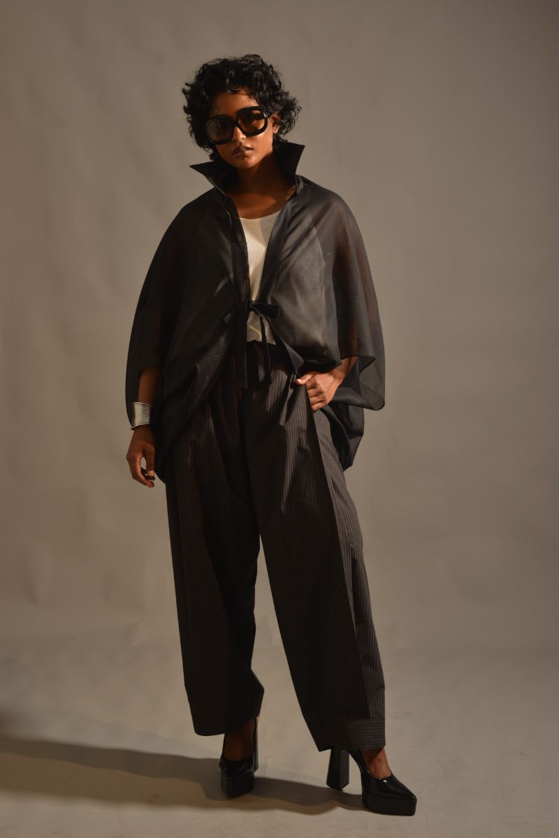 Elevate your layering game with this statement Sable Jacket, designed with dramatic dolman sleeves and a bold stand-up collar that frames the face with effortless edge. The relaxed silhouette adds a contemporary twist, while the front tie string offers adjustable styling — cinch it in or let it flow for a relaxed vibe.