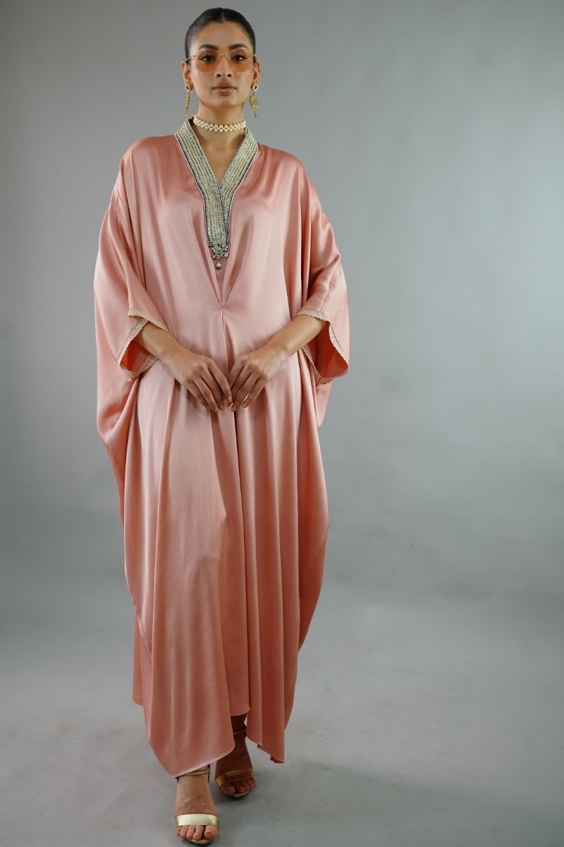 Luxurious silk Kaftan in luxe silk, beautifully draped and pleated at front, adorned with hand embellished collar. The Kaftan is trimmed with delicate lace at sleeve.