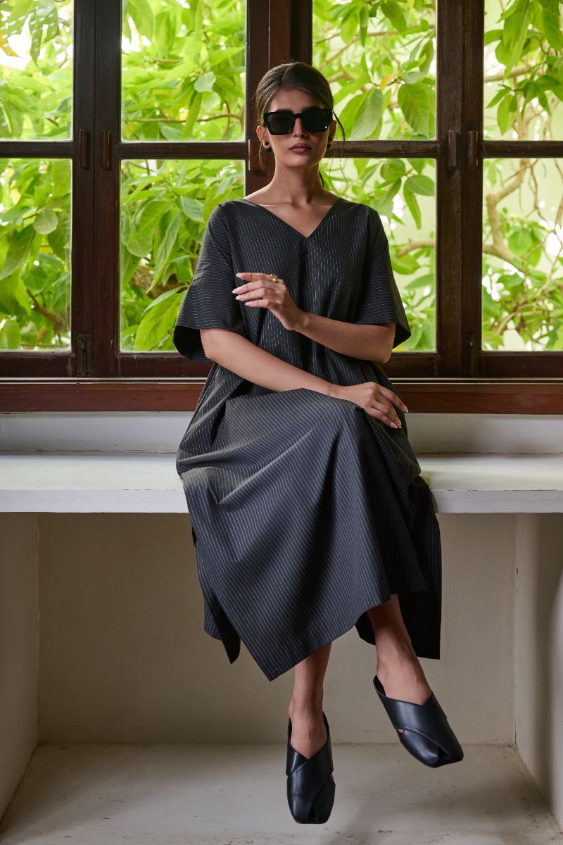 Sharp meets breezy in this black pinstripe dress, tailored with a loose boxy cut and breezy side slits for movement. The relaxed silhouette keeps it cool and effortless, while the subtle stripes bring just the right edge.
