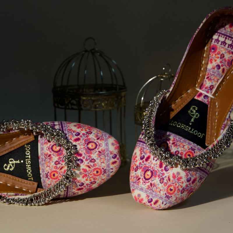Our Rose Garden khussa features delicate blush and lavender floral clusters digitally printed on velvet, drawing inspiration from traditional block-printing techniques and is framed by a delicate metallic-bead fringe that catches the light with every step. As each pair is assembled entirely by hand, slight variations in print intensity and bead placement make yours truly one-of-a-kind. Style them with soft pastel palazzo pants and silver anklets for a breezy daytime look, or let the rosy palette pop against a monochrome ivory kurta for evening gatherings. To keep them looking their best, gently spot-clean with a damp cloth and store in a cool, dry place away from direct sunlight.