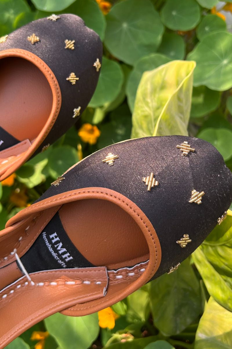 Beautifully embellished with black stones on luxurious black rawsilk, this khussa features a soft, comfortable and durable sole-perfect for effortless all-day wear.