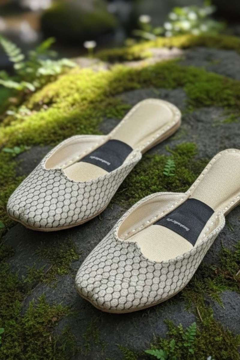 Introducing the sophisticated Backopen Khussa shoes adorned with a refined scaly print on a creamy base color, exuding an elegant charm. The light hues seamlessly complement any attire, making these shoes a versatile and stylish choice for a variety of dresses.