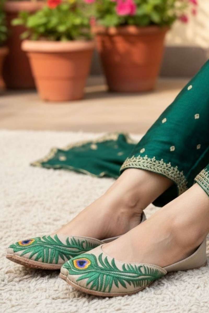 The "Morni Khussa" is a stunning tribute to traditional elegance, featuring a magnificent peacock feather embroidery that captures the bird's natural beauty and vibrant colors. The intricate threadwork, in rich blues, greens, and gold, stands out beautifully against the sophisticated Beige Gold Raw Silk base, which has a plain back. Designed to provide maximum comfort, this handcrafted shoe is exceptionally soft, comfortable, and easy to wear, built with a double-padded sole and back for superior, all-day support. Constructed with a durable sole for reliable wear, the Morni Khussa is the perfect statement piece, blending artistry with superior wearability.