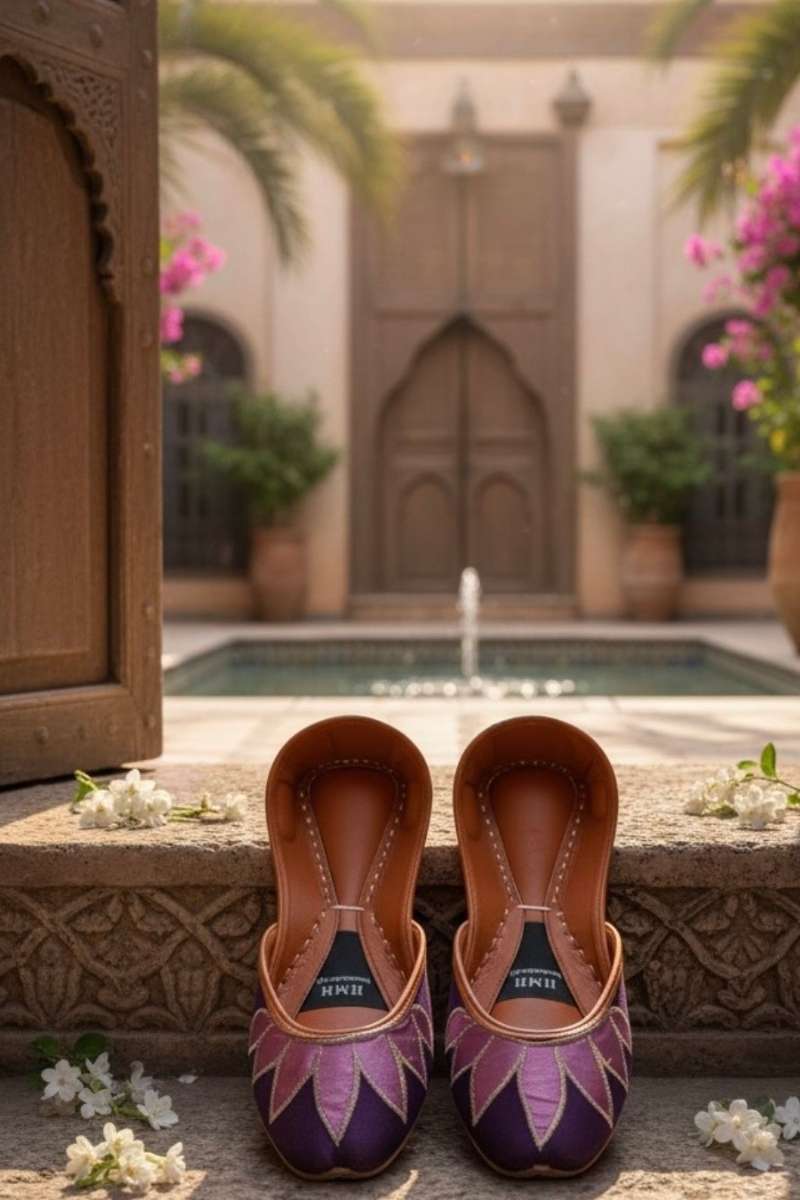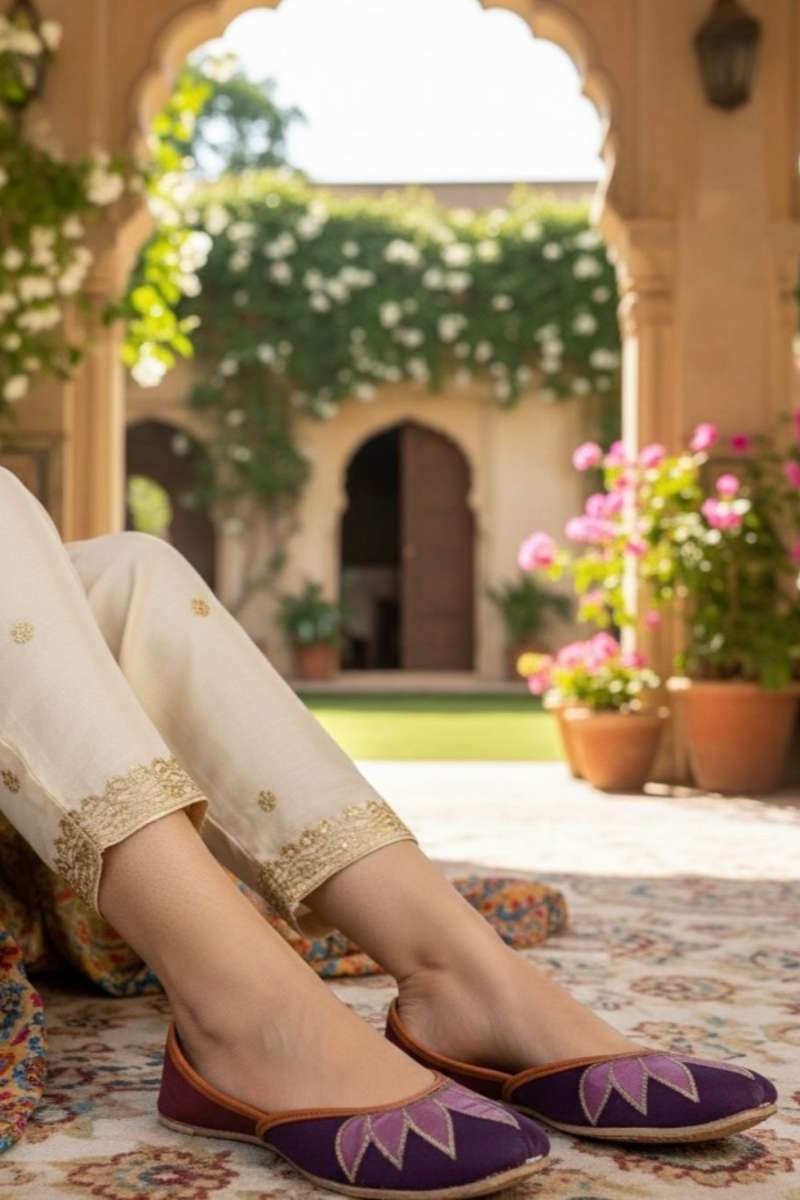 Step out in majestic style with the handcrafted "Orchid Bloom Khussa". This beautiful footwear features a rich purple raw silk base, giving it a luxurious matte texture. The design boasts a plain back that beautifully contrasts with the intricately embroidered upper, which features a distinct Petal/Geometric Motif using a contrasting pink cloth. The motif is further embellished with elegant tilla (metallic thread work) accents, ensuring the shoe catches the eye. Combining stunning artistry with superior comfort, this khussa is exceptionally soft, comfortable, and easy to wear, built with a double-padded sole and back for maximum, lasting support, and finished with a durable sole for reliable wear, making it perfect for festive wear and special occasions.