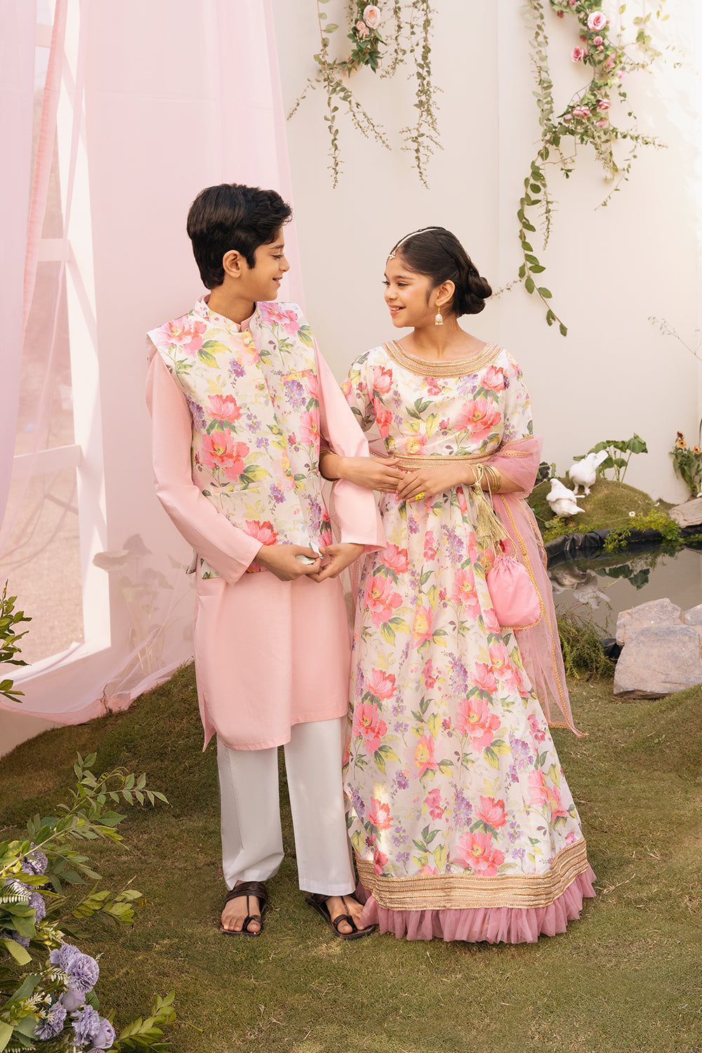 Crafted from ethereal and soft, fine silk, this stunning waistcoat is awash with blooming flowers in shades of pink against a cream background. Adorned with fabric Dorset buttons,