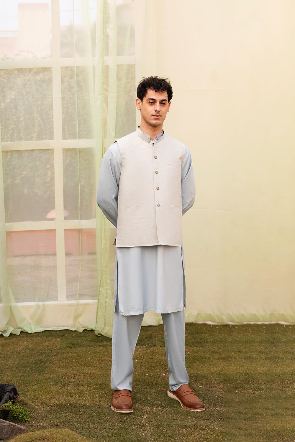 Our Eid Edit this year presents is lovely garden inspired blooming floral and orchids prints and colours in bringt cheerful hues! That is exactly what inspired us to create our Tree of life style this festive season. As dreamy as its name, this Waistcoat is crafted in soft grey cotton chambray fabric and lined with soft silk, the outfit features ivory wooden buttons.
