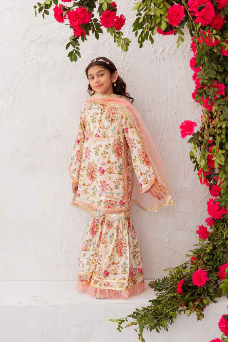 Step into our lovely garden with blooming roses and orchids! This Absolutely Blooming Gharara Set is straight out of a royal princess storybook. As dreamy as its name, It's a three-piece ensemble crafted in swiss voile lawn, keeping the approaching summer season in mind.