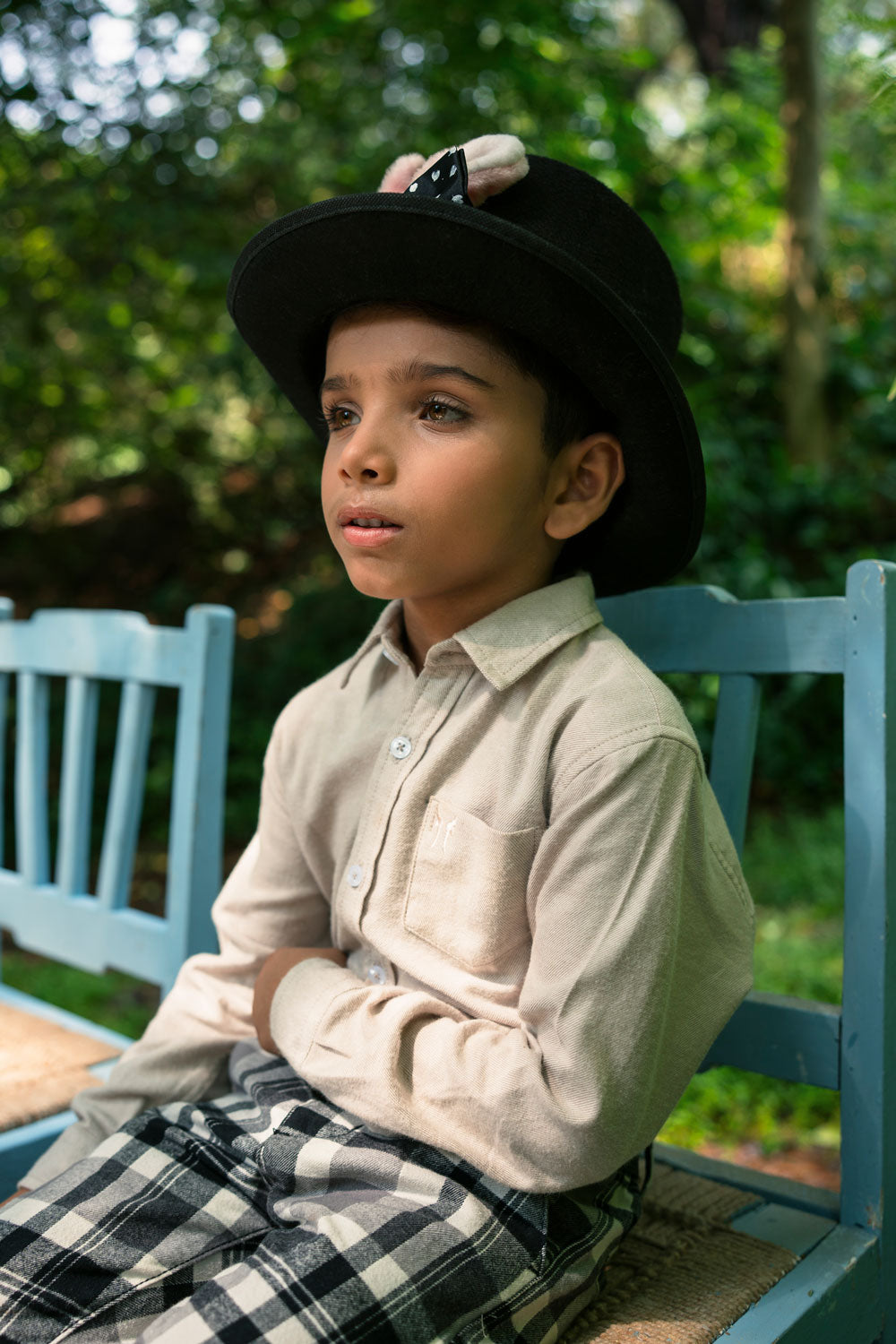 This season, we're focused on bringing to you the classics that would become a style staple in your children's wardrobes and can be passed on to siblings! This super soft and warm shirt for formal engagements has just the kind of classic look we're talking about. Crafted with great care and love, the front open, button down shirt is imagined in a gentle beige colour in a woollen fabric. It features a straight point collar and a left sided front pocket, which proudly carries our logo embroidered in monochrome beige silk thread. Pair it with our formal checkered woollen pants for this old school charm ensemble.