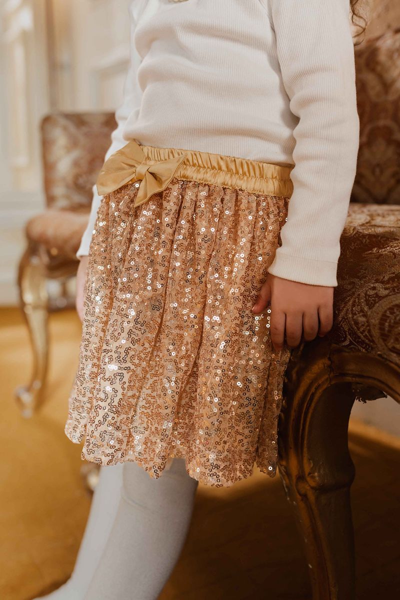 Hummingbirds designs for little girls who like to stand out and this sequin-embellished skirt will certainly do that. Your little one is sure to dazzle the room with these light-catching shimmery gold sequins that will glisten as she twirls the evening away. Finished with a satin bow & elasticated waistband , the skirt is lined with soft silk and gathers at the waist. The star from our Party Collection, this skirt is sure to become one of your mini diva's favorites. Just style this with her dancing shoes and she'll be ready to go!