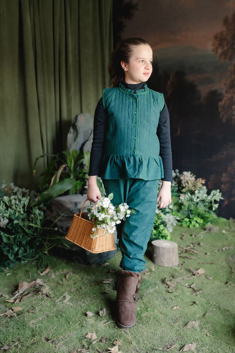 Hummingbirds is known for its opulent and classic designs, we have been exploring and developing our distinct style since 2019. When it comes to contemporary offerings from our new collection, the color combination of green on green has become something of a signature. As such, this gilet wraps youngsters in the established codes of the label as well as keeping them warm.