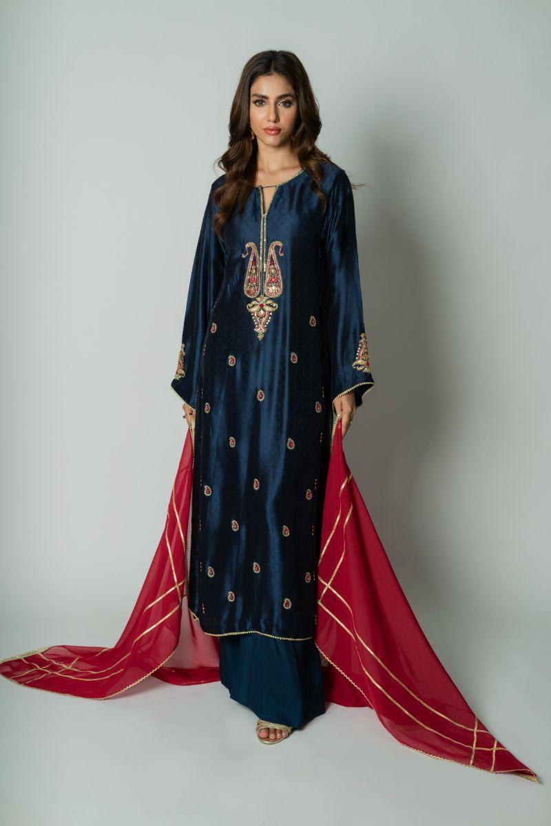 Insia Sohail - Leila - Navy - Embossed Silk
