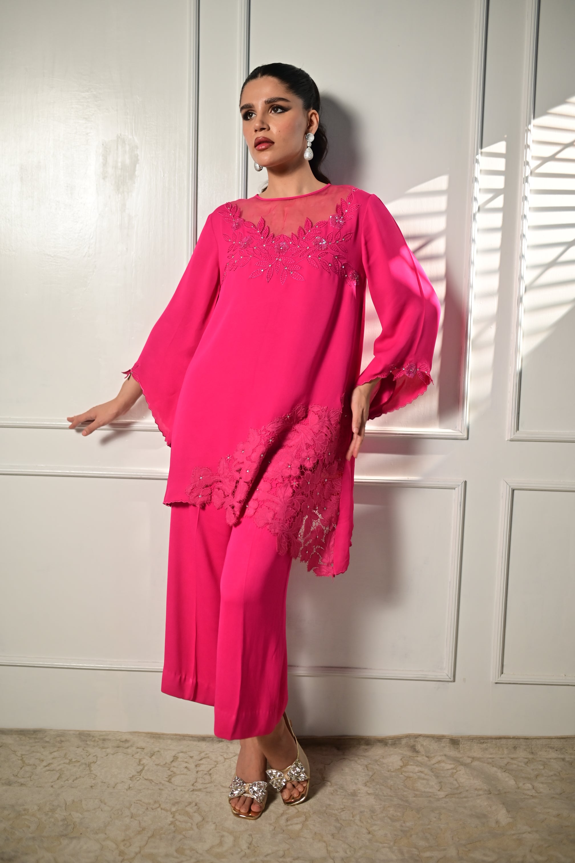 Make a dazzling statement in this hot pink semi formal ensemble featuring a sheer organza neckline richly hand embellished on both front and back. The symmetrical hem is detailed with elegant schiffli accents for timeless charm. Scalloped sleeves shine with delicate french knotted embriodered adding refined artistry. Paired with stylish culottes, this look effortlessly blends modern edge with dreamy sophistication. Bold, beautiful, and irresistibly eye catching perfect for any standout occasion.