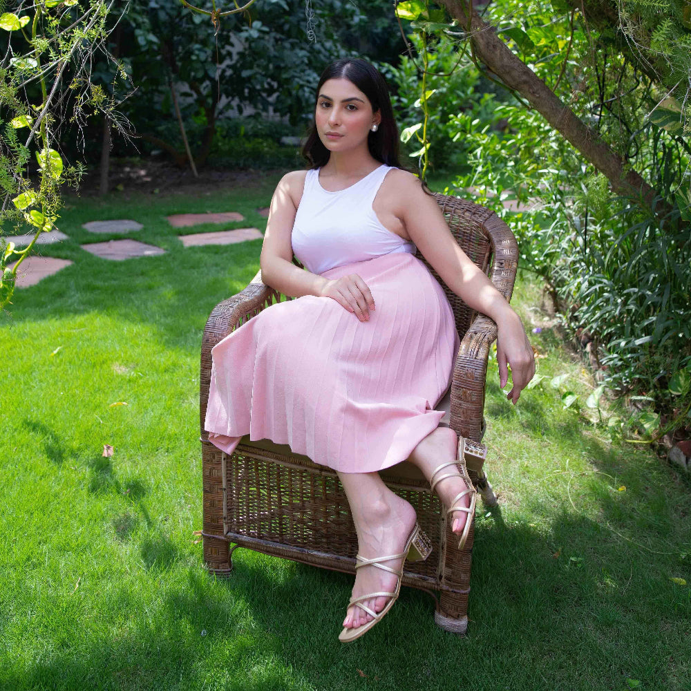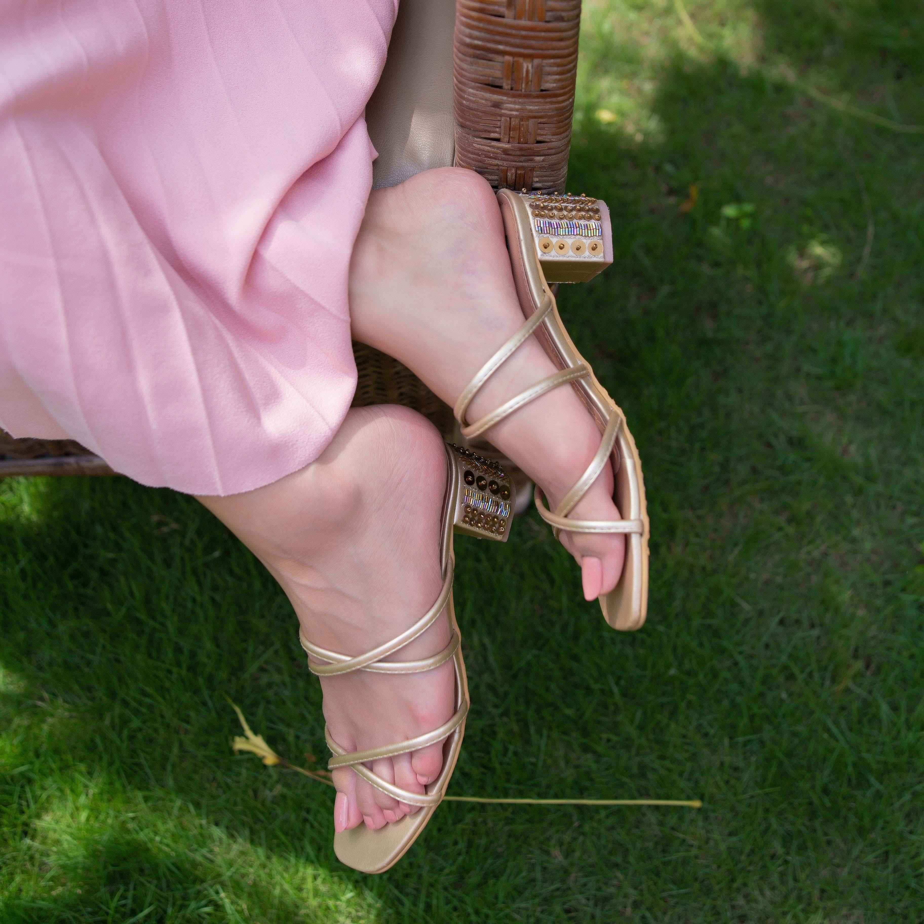 Introducing Jazz- where sleek meets dazzling elegance in every step! These heels exude sophistication with their sleek strappy upper, complemented by a nude foot bed and gold toe and rand for a touch of understated glamour. But it's the heel of this pair that truly steals the show, capturing all the spotlight with its magnifying bling and unmatched charisma. Heel is adorned with sequence, gold disks and cooper beads. With Jazz you'll shine bright like the star you are, commanding attention wherever you go with effortless grace and style. Step into Jazz and let your feet light up the night.