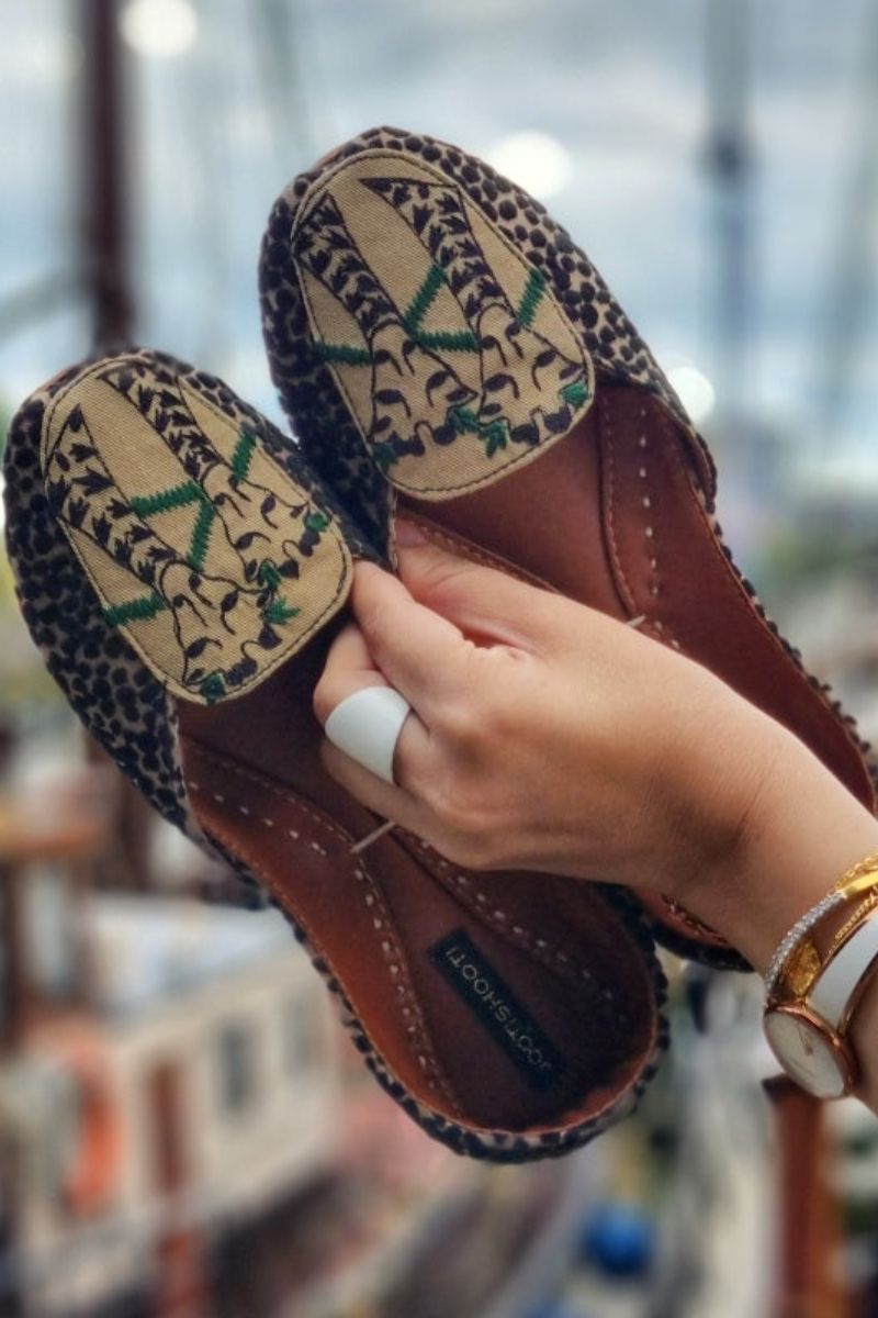 Holidaze – loafers crafted with fawn and black denim, featuring embroidered giraffes and giving off safari vibes. The padded soles make walking thousands of steps daily very easy. Add to cart for you next holiday!
