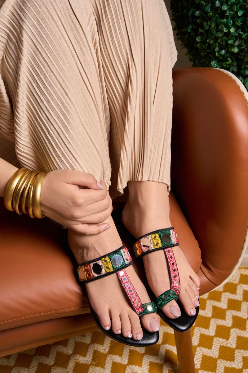 Add a touch of exotic glamour to your loungewear routine with our Tribal Oasis Kolhapuri, featuring a sleek black background, vibrant tribal embroidery, and shimmering mirrors. These Kolhapuris are designed to make a statement while keeping your feet cozy and comfortable.
