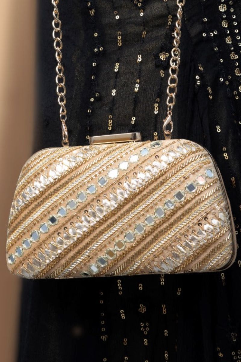 Enhance your style with our exquisitely designed clutch, featuring a luxurious gold-toned finish and mirror detailing. The diagonal patterns, with intricate metallic accents, add a touch of sophistication, making it the perfect accessory for weddings, parties, or festive occasions. This piece exudes elegance and is a must-have addition to your evening wardrobe.