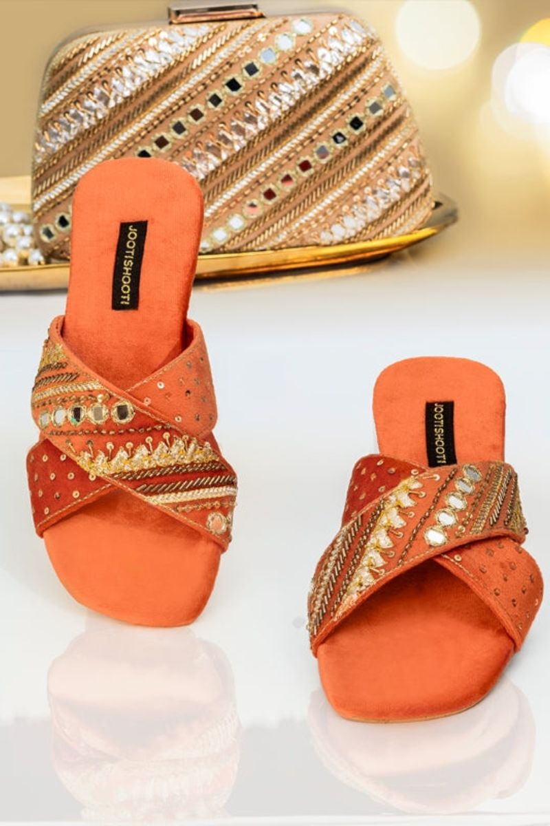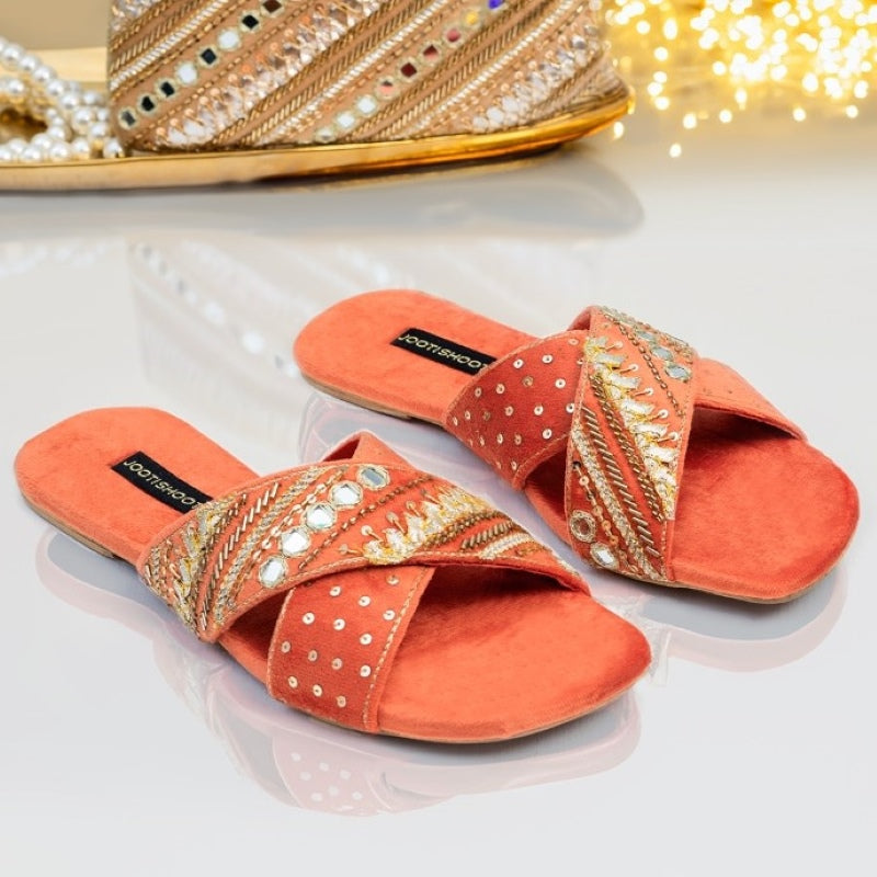 Step into the wedding season with style and celebrate the artistry of hand-crafted footwear with utmost comfort with our Orange Ronak slides . Each pair is a testament to the beauty of handwork.