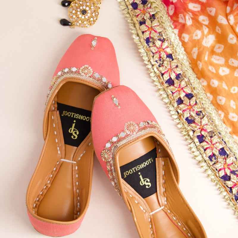 A festive khussa with a clean V neckline framed in mirror work and zari florals. Each pair features hand placed beads, a single crystal drop at the toe, and a soft suede touch upper. The insole is gently cushioned and the flexible sole makes long events easy from dholki to walima.